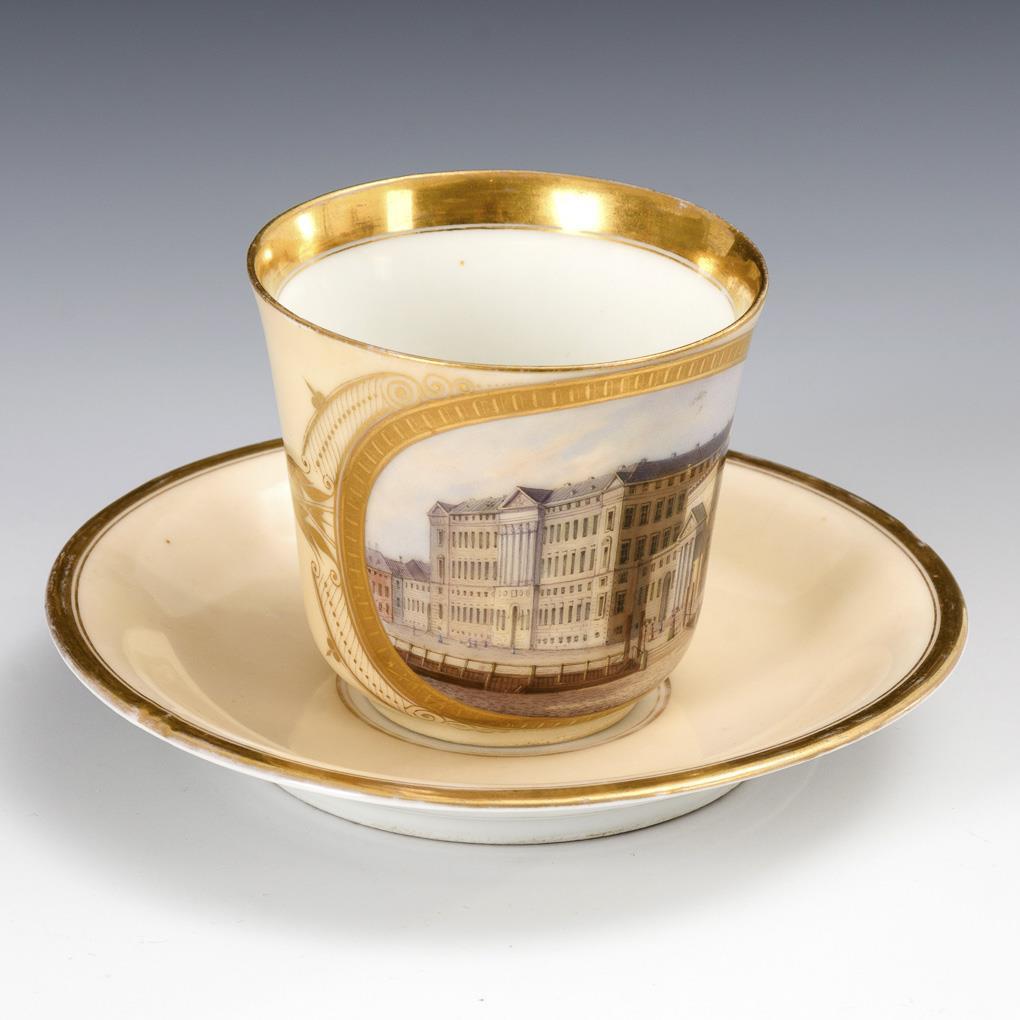 Polychrom bemalt, goldstaffiert. H Tasse 7 cm, Ø originale Untertasse 13,5 cm.
