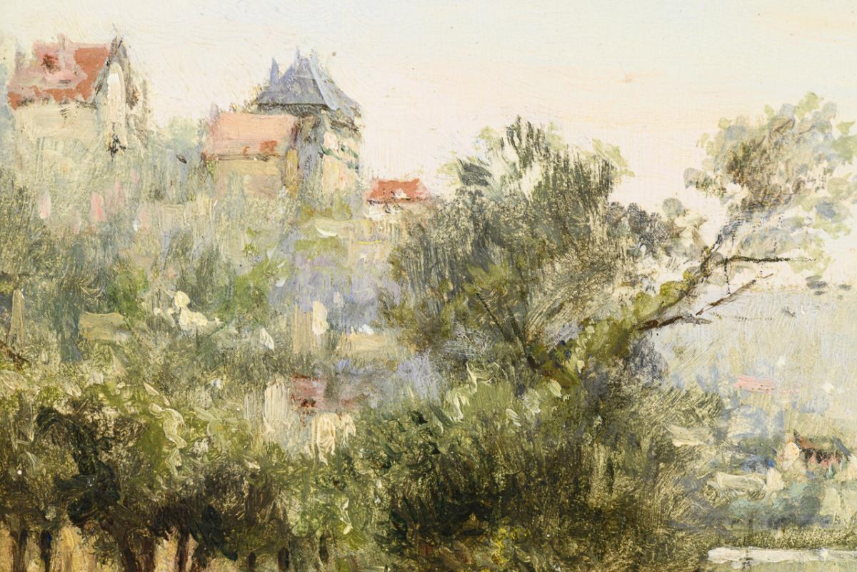 Sonnige Gegend mit ruhigem Fluss und einer Stadt am Hang. Im Himmel retuschiert.