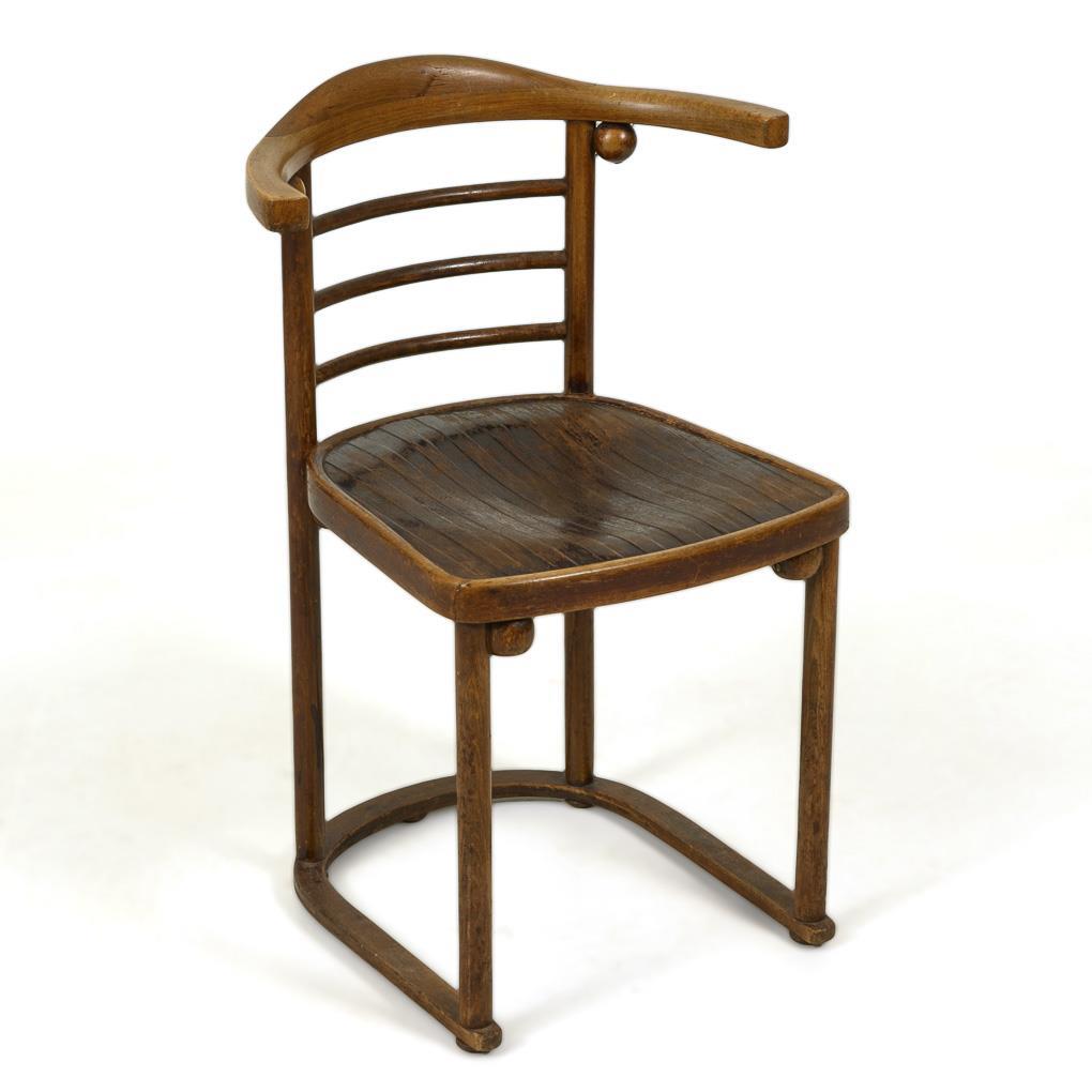 Josef Hoffmann (1870 Piernitz - 1956 Wien), Innenarchitekt und Möbeldesigner, Mitbegründer der Wiener Werkstätte. Bugholz wird durch ein von Michael Thonet um 1830 entwickeltes Verfahren unter Wasserdampf gebogen. Nachdem das 1856 erteilte Privileg zur "Herstellung von Möbeln aus massiv gebogenem Holz" 1869 annulliert wurde, entstanden zahlreiche Möbelfabriken - darunter auch J. & J. Kohn, die das Verfahren so weiterentwickelten, dass ebenso kantige Holzstäbe verarbeitet werden konnten.