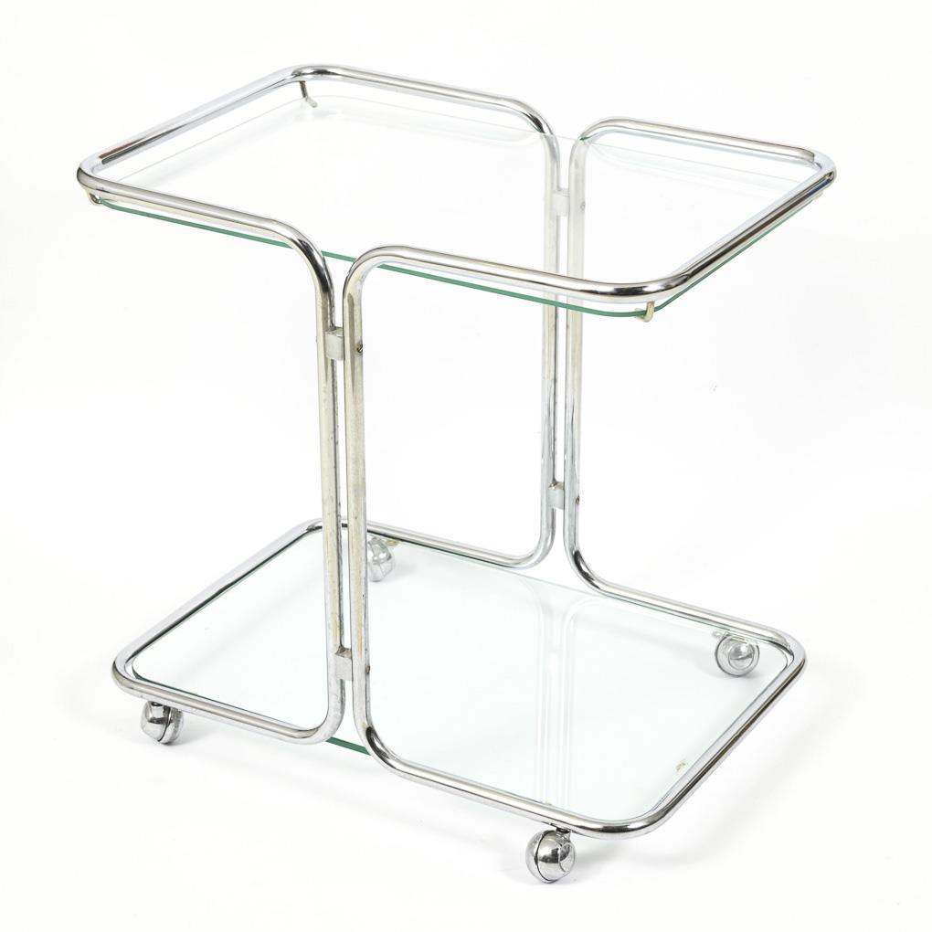 Rollbarer Teewagen (sogenannte Desserte) aus verchromtem Gestell mit 2 Glasablagen. Metall mit Korrosionsspuren.