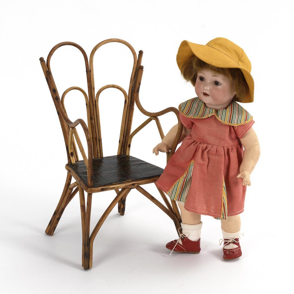 Kurbelkopf, braune Schlafaugen, goldblonde Mohairperücke. 5-teiliger Stehpuppenkörper. Rosa Kleidchen, rote Schuhe, gelber Hut. Dazu Rattan-Stuhl mit schwarzer Wachstuch-Sitzfläche (H 28,5 cm). Kopf durchleuchtet: ohne Defekte, 1 Augenlid fehlt.