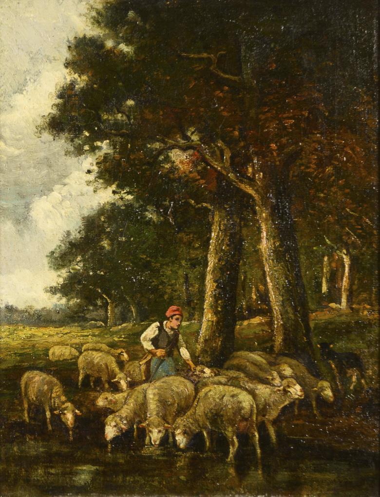 Hirte mit den Tieren am Ufer eines Gewässers am Waldrand. Leinwand doubliert.