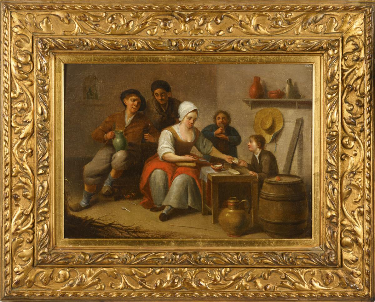 Die Familie mit den Kindern beim Essen in der Stube nach getaner Arbeit. Altersspuren.