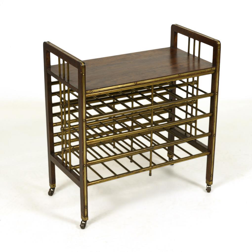 Rollbarer, kastenförmiger Zeitungsständer mit 4 Ablagen aus Messingstäben und 1 Ablagefläche. Restauriert, Alters-/Gebrauchsspuren.