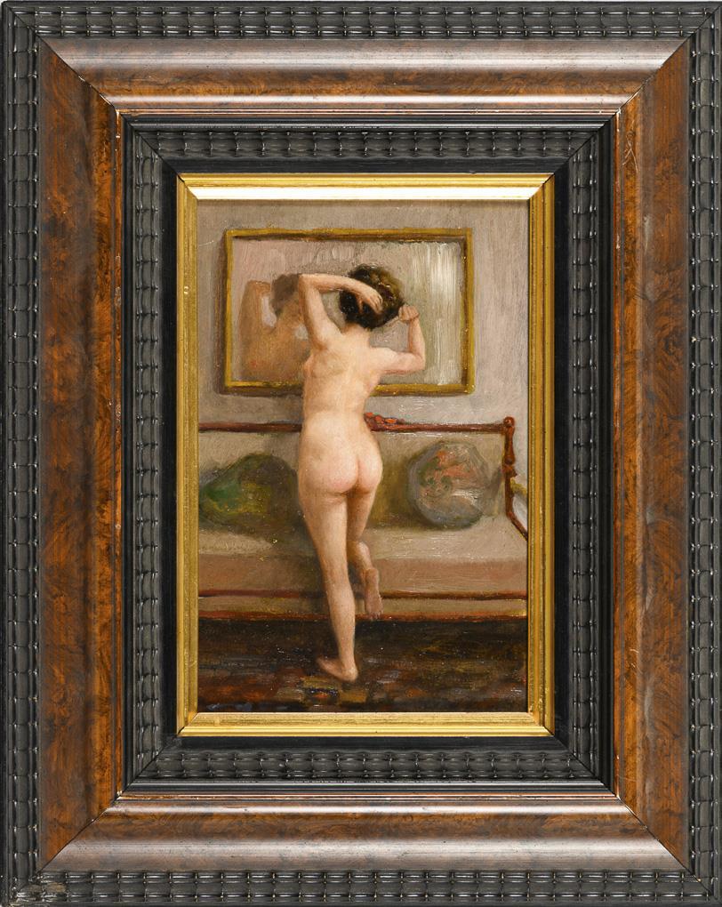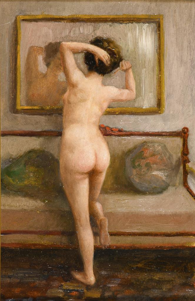 Mit dem Rücken zum Betrachter stehende nackte Frau vor einem Spiegel. Leichte Altersspuren.