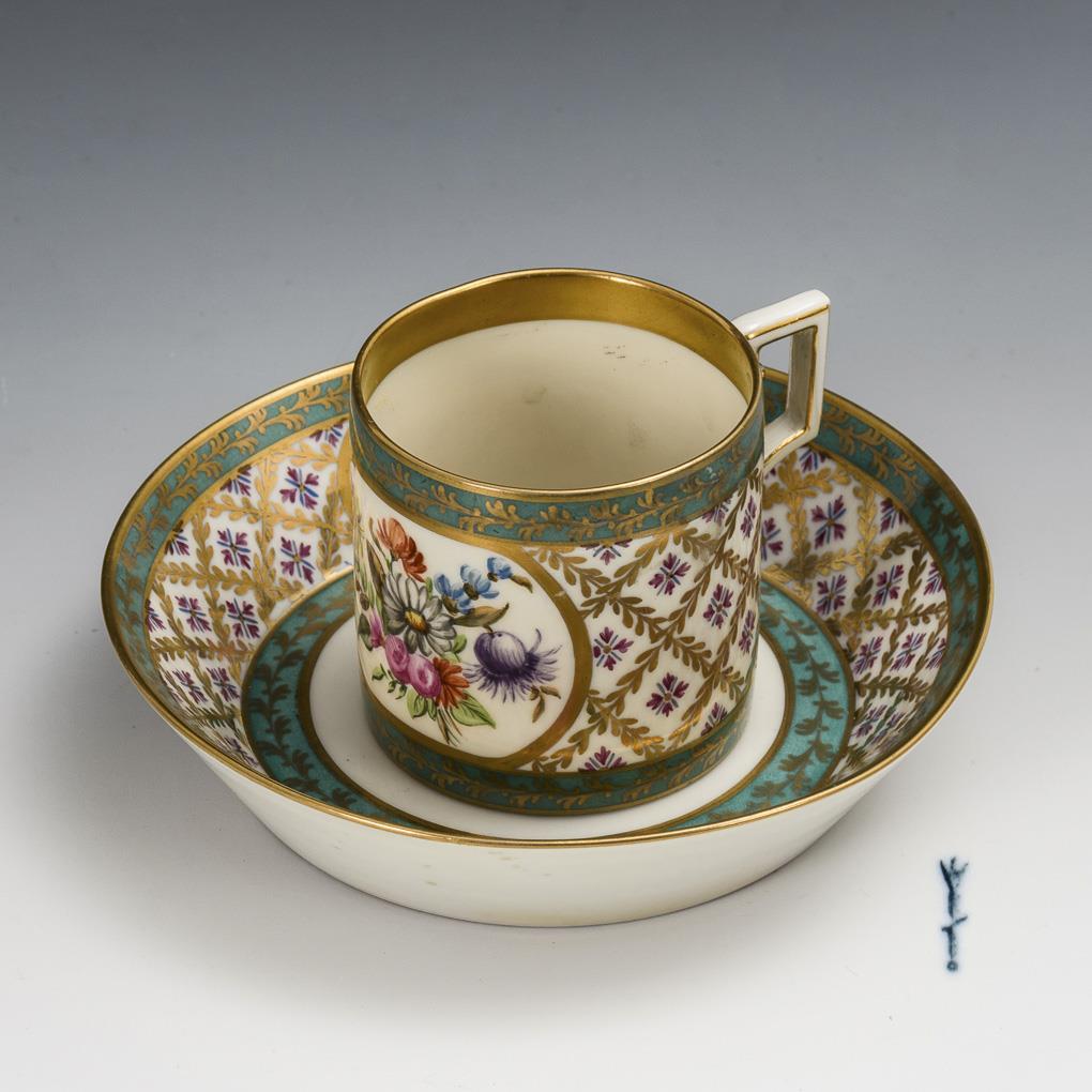 Polychrom bemalt, goldstaffiert. H Tasse 6,5 cm, Ø originale Untertasse 13,5 cm.