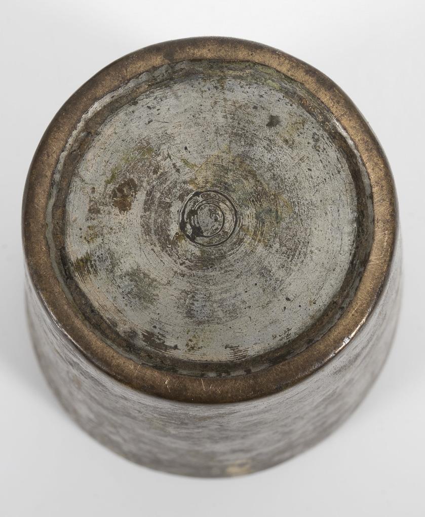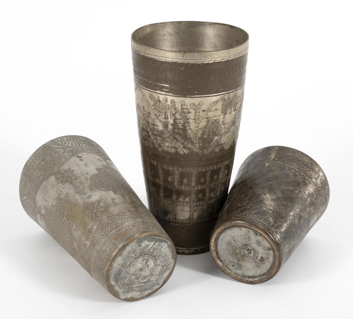 Metallbecher mit ziselierten Mustern. Vom einfachen Ornament zu sehr kunstvoll und fein gearbeiteten Ornamenten. Alters- und Gebrauchsspuren.