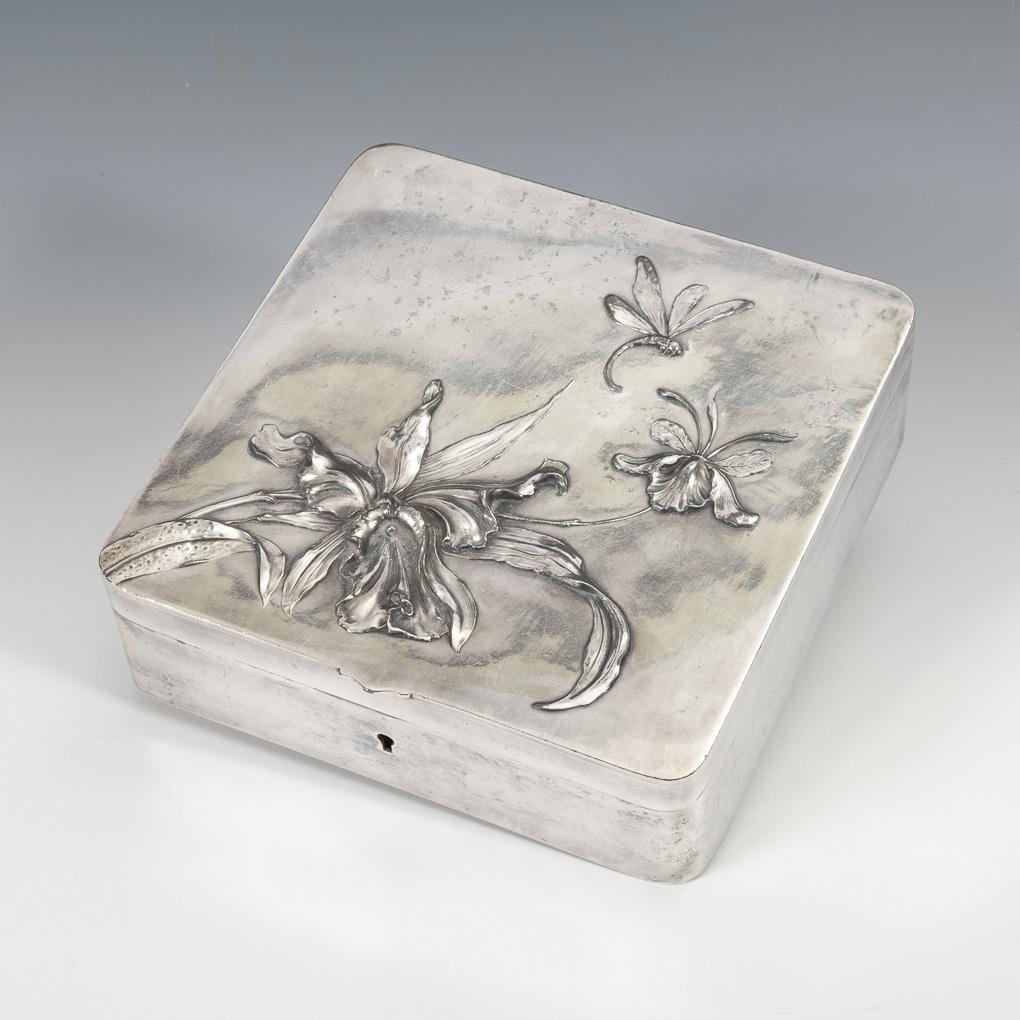 Versilberte Jugendstil-Schatulle mit Lilienrelief.