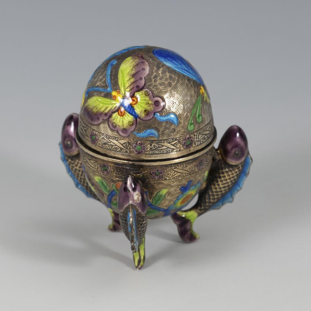 Eiförmige Dose mit drei Fischen als Beine und farbkräftigen Blüten und Schmetterlingen auf ziseliertem Grund.