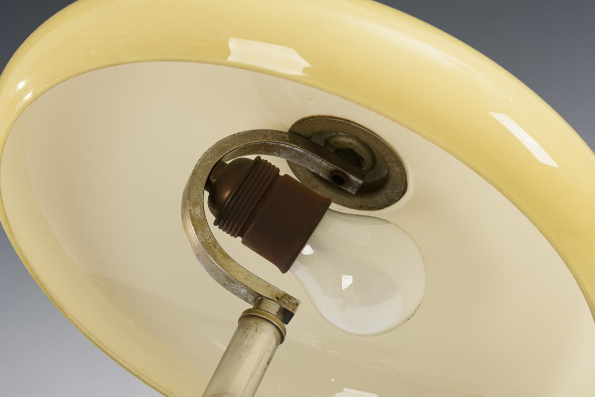 Pilzförmige Design-Lampe mit Druckknopf auf dem Rundfuß. Unter dem Schirm 1-flammige Schraubfassung. Minimale Alters-/Gebrauchsspuren.