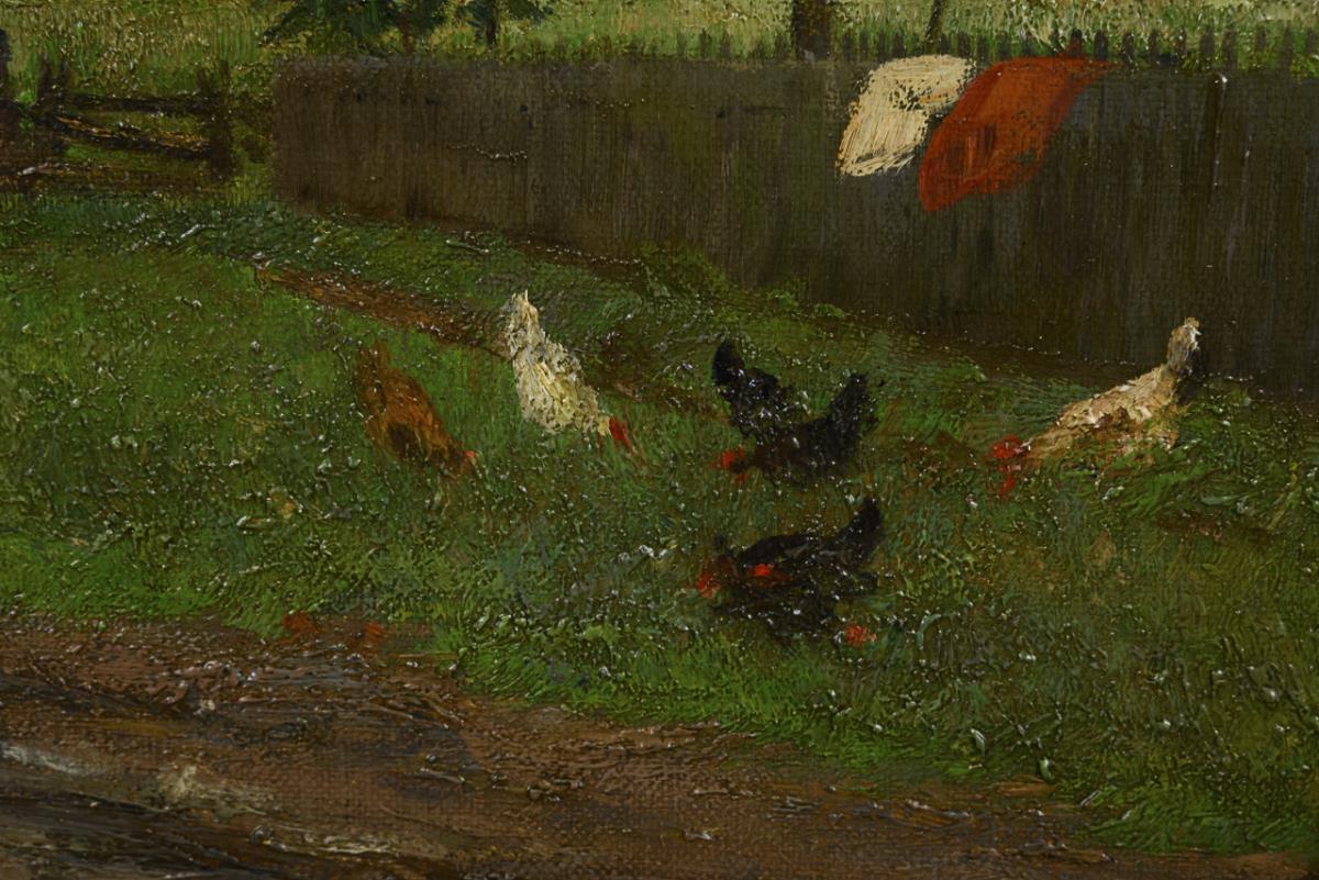 Hühner auf der Wiese nahe dem Zaun mit Blick über das Feld zum Bauernhaus unter bewölktem Himmel. Minimale Altersspuren.