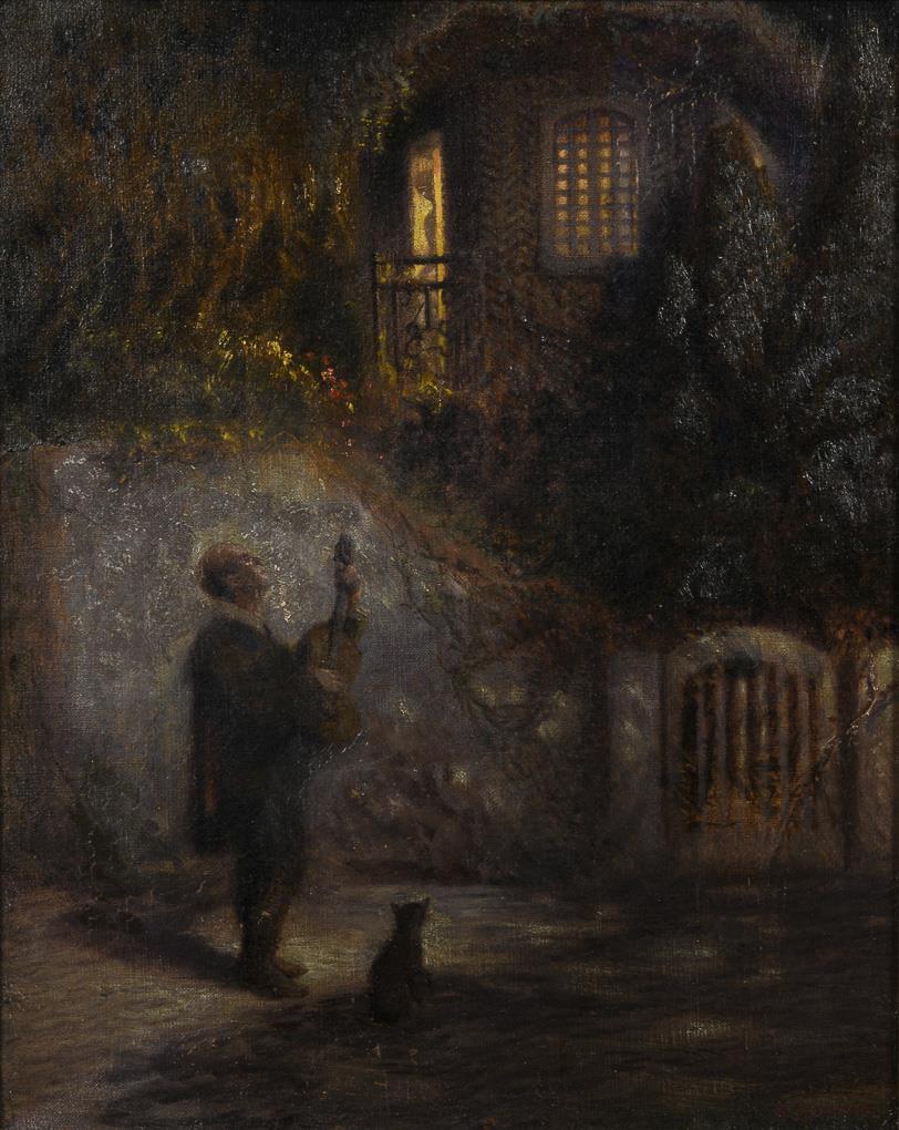 Singender Musikant mit Gitarre und einer Katze an der Gartenmauer unter einem beleuchteten Fenster mit Frauensilhouette. Eine restaurierte Stelle mit Hinterklebung.