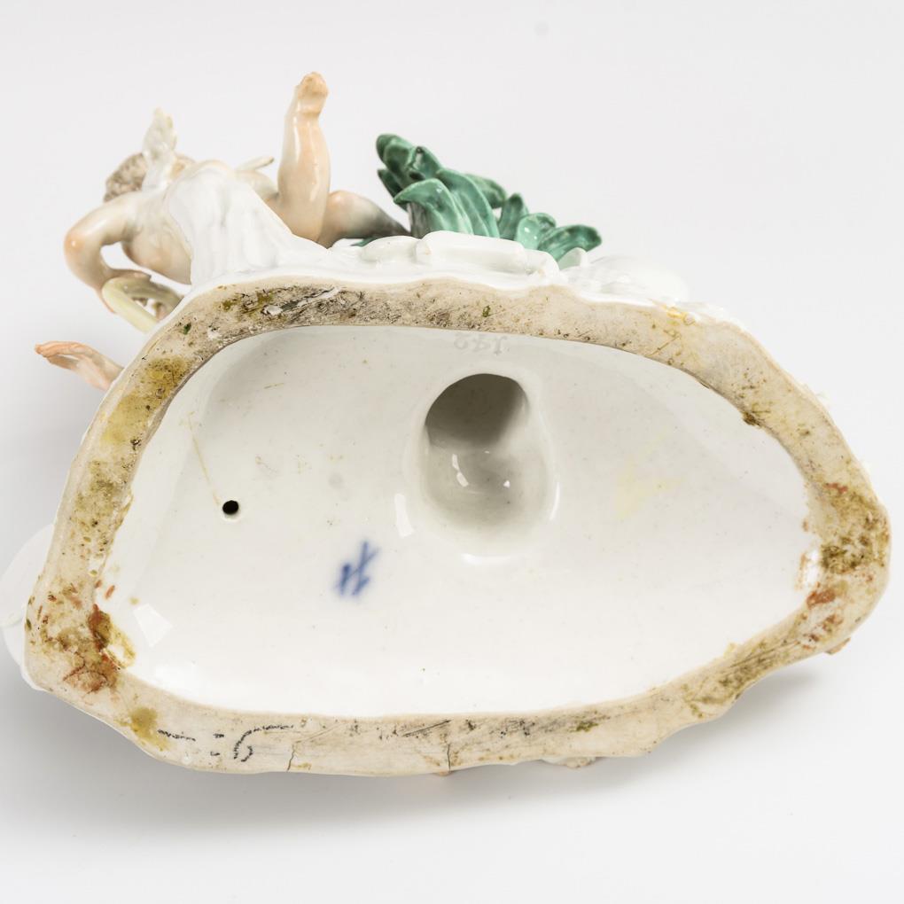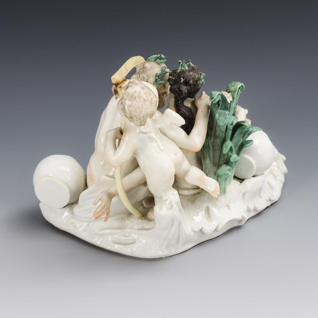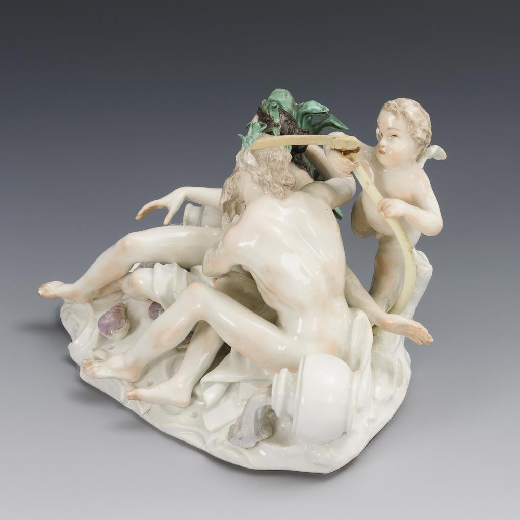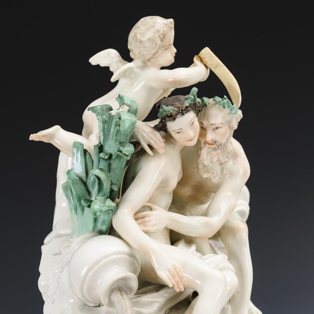 Auf einem Natursockel mit Muscheln und Wasserkrügen sitzendes, sich umarmendes Flussgötterpaar sowie ein Amorknabe mit Stab. 1 Blatt und 1 Fuß bestoßen, kleiner Brandriss am Sockelrand, Sensenblatt am Puttenstab frei ergänzt.
