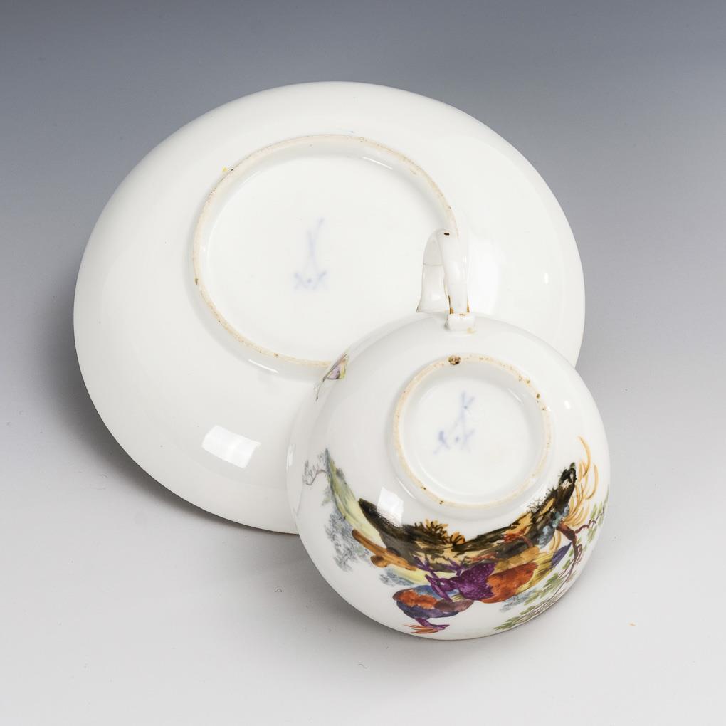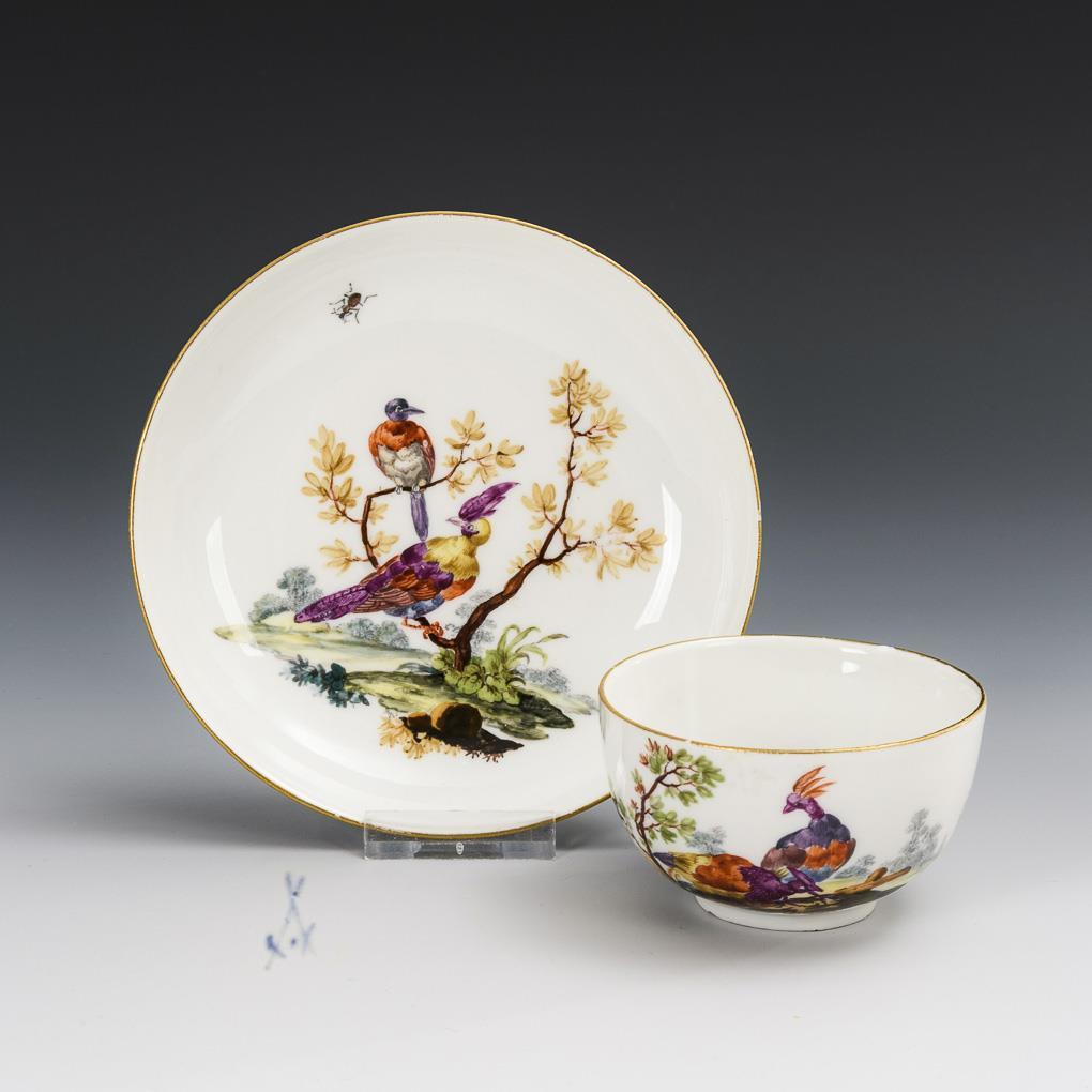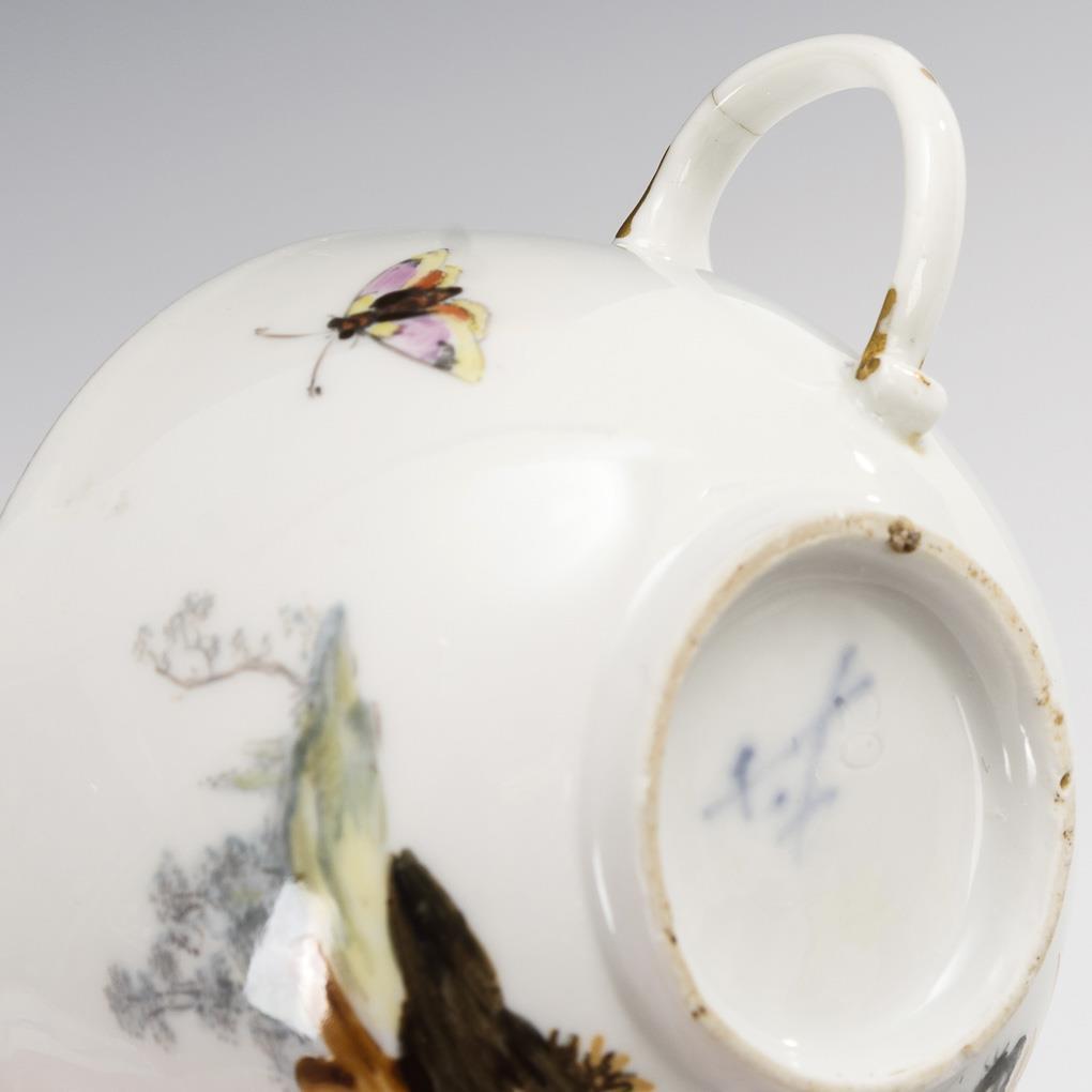 Bauchige Tasse mit Ohrenhenkel. Schauseitig sowie im Spiegel der Untertasse die Darstellung einer Landschaftsinsel mit exotischen Vögeln. Minimaler Goldabrieb, Bestoßung am Tassenrand, Haarriss im Tassenhenkel.