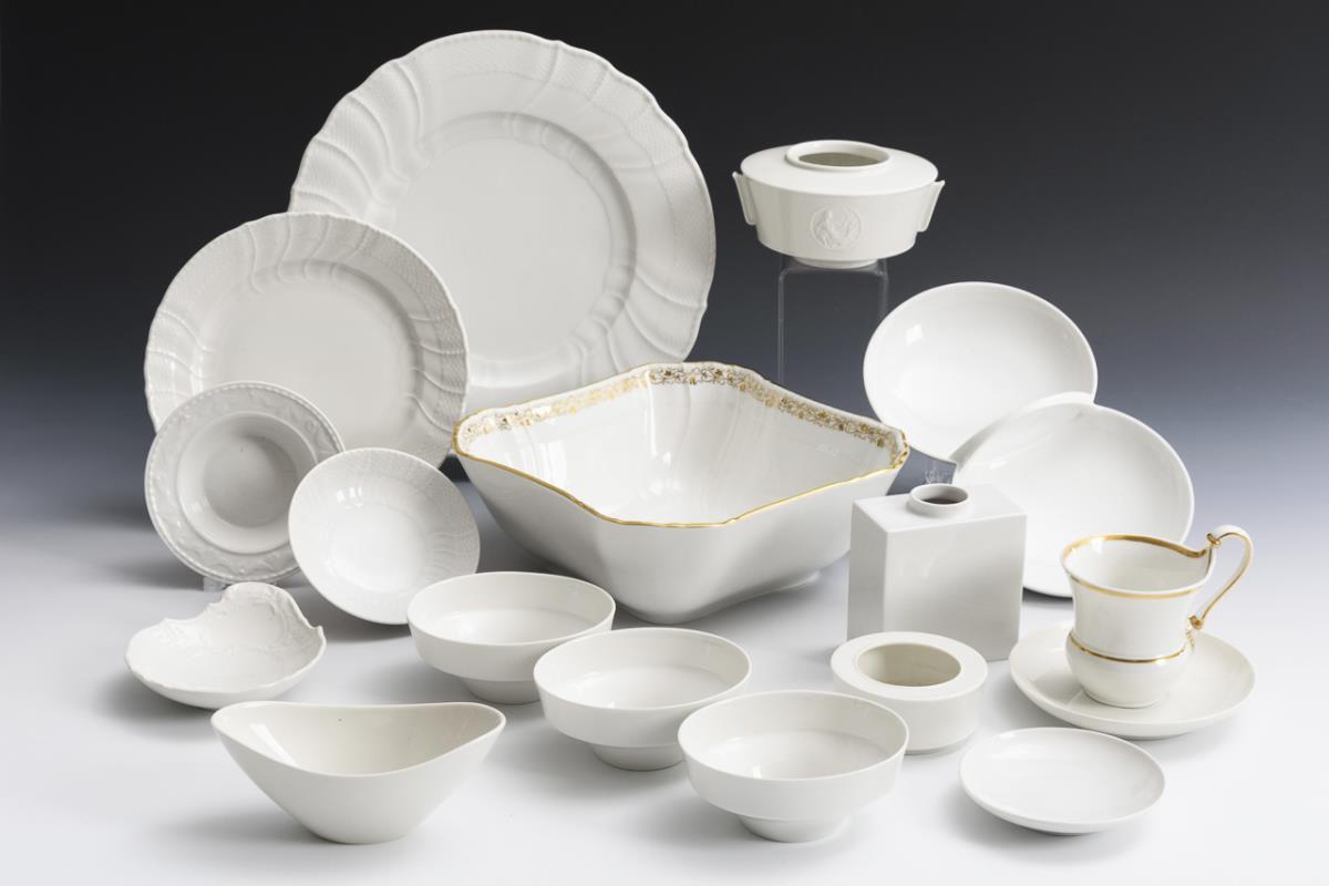 5x Modell "Neuozier": 3 Teller (Ø 11 - 27,5 cm), 1 Quadratschüssel (22,5 x 22,5 cm) und 1 Muschelschale (Ø 12 cm). / 1 Schale "Kurländer Muster" (Ø 12 cm). / 1 Tasse mit Palmettenhenkel (H 9,5 cm). / 10 moderne Porzellane, teils Entwurf von Trude Petri: Dose aus dem "Arkadischen Teeservice" (H 7,5 cm), Teedose, 3 Ovalschälchen, 2 kleine Teller, 1 Doppelschale (L 25 cm) sowie 2 verschiedene Schalen.