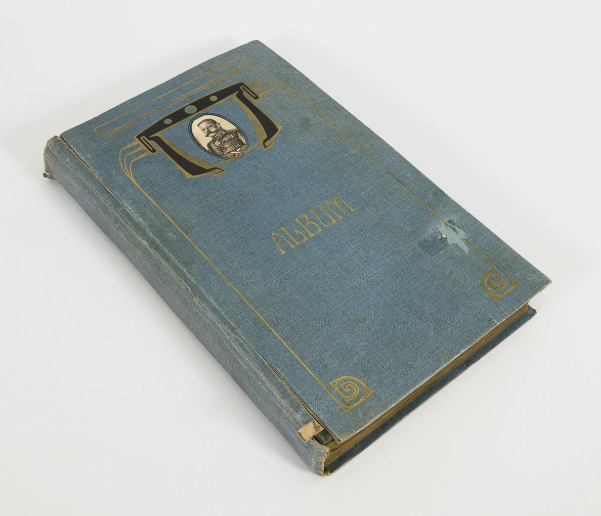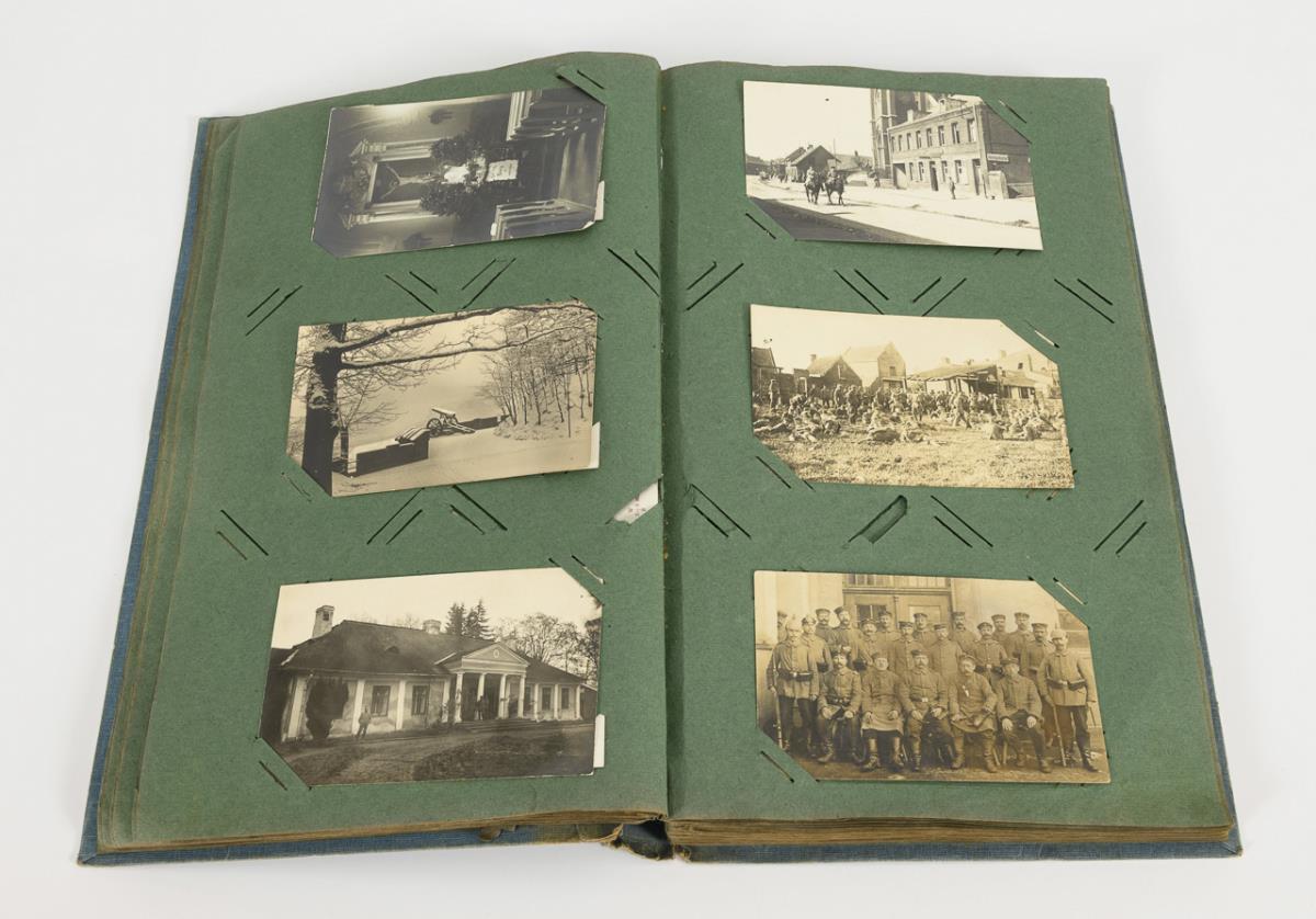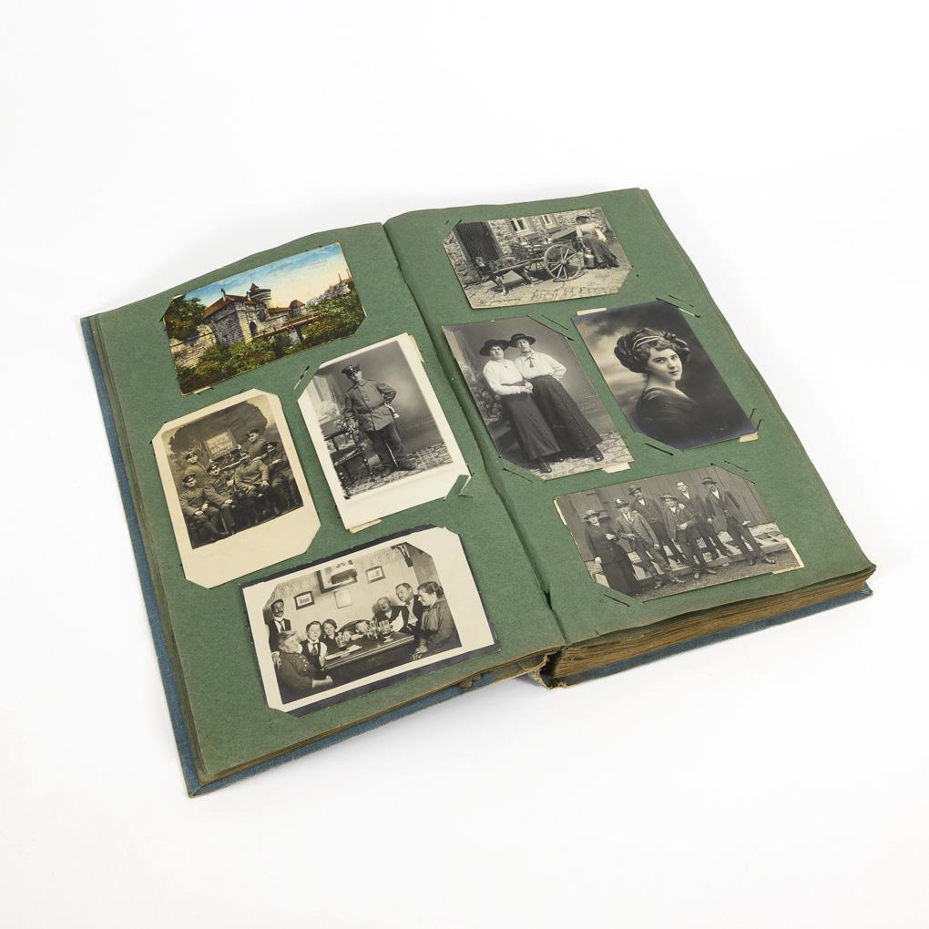 Viele Personenenfotos, darunter viel Militär I. Weltkrieg, u.a. eine Maschinengewehrbesatzung. Blaugrünes "Album" mit Hindenburgbildnis.