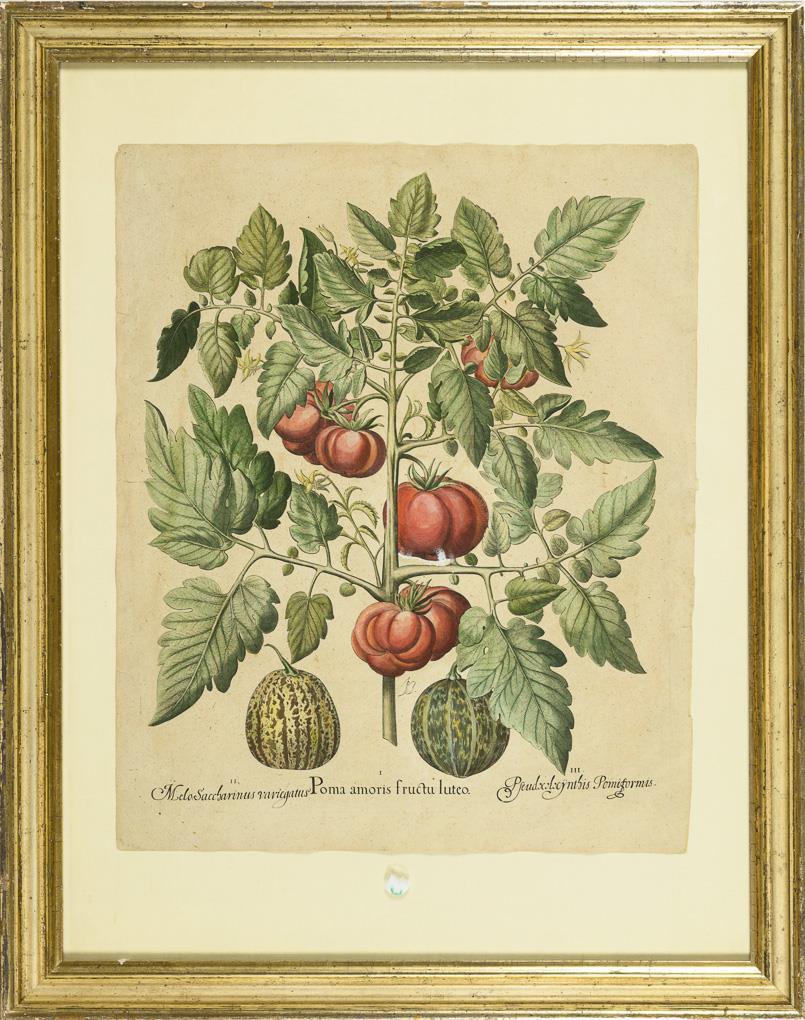 Präzise Darstellung einer Tomatenpflanze "Poma amoris fructu luteo", einer Zuckermelone "Melo saccharinus variegatus" und einer Bittermelone "Pseudo pseudocolocynthis pomiformis" aus dem botanischen Prachtwerk "Hortus Eystettensis" (Eichstätter Garten) mit 1100 Pflanzen aus aller Welt, das 1613 erstmals in sogenannter Königsgröße (55 x 47 cm) herausgegeben wurde. Blatt etwas griffspurig.