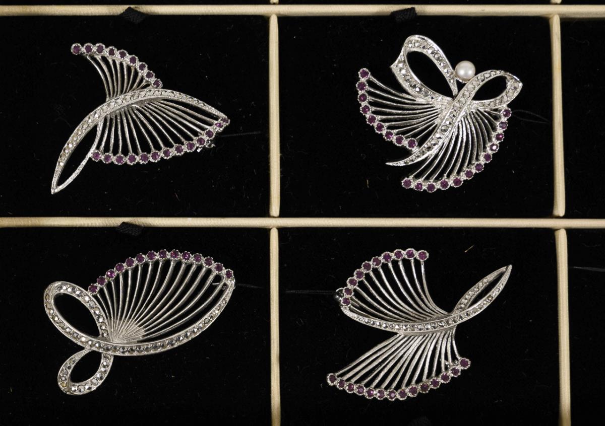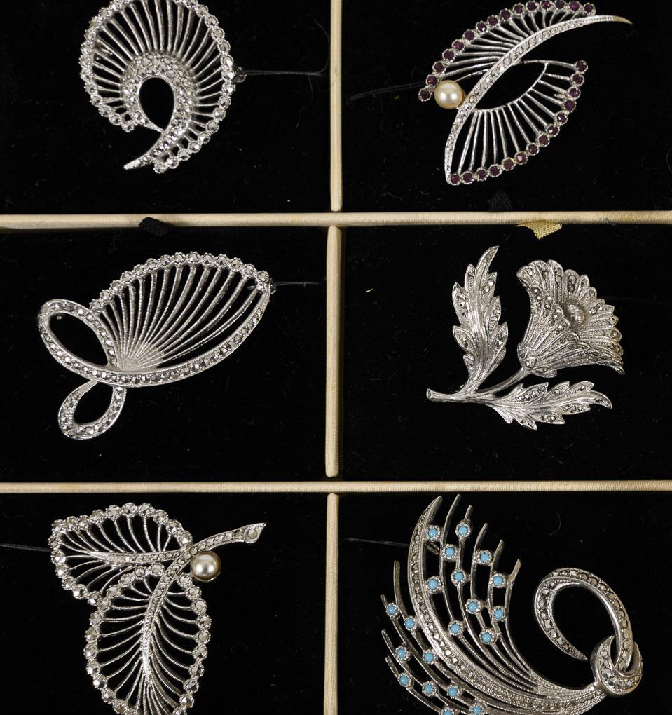 32 Modeschmuckbroschen mit Markasiten auf Vertreterpaletten.