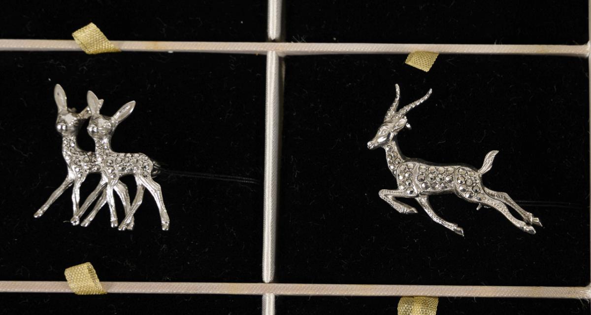 Plastisch gegossene Tier-, Phantasieblüten- und Blätterbroschen mit Markasitbesatz. Kugelhaken.