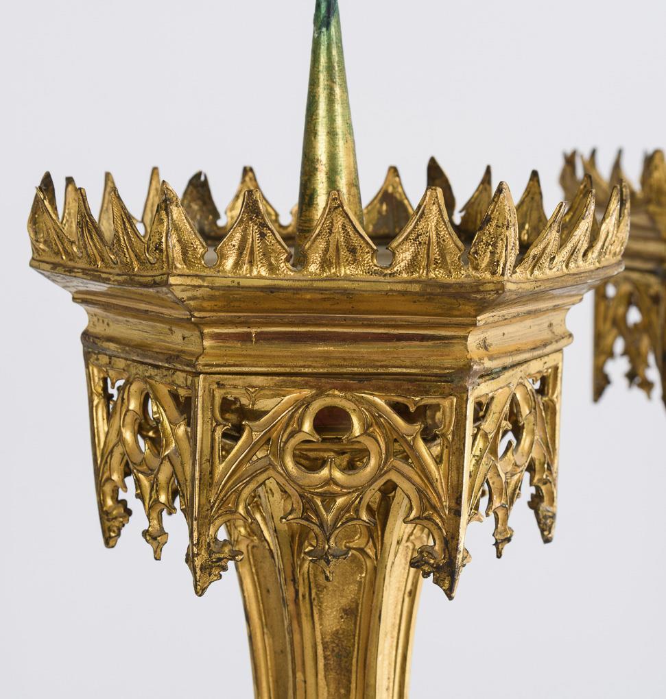 Aufwändig gearbeitete Kerzenleuchter mit architektonischen Elementen: 3 Strebepfeiler mit Krabben am oktogonalen Sockel, Maßwerk an Sockel, Schaft und Wachsteller sowie Blatt-Blumen-Applik am Nodus. Berieben, teils etwas verbeult.