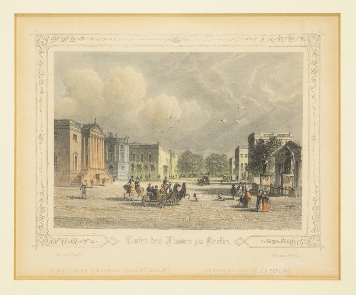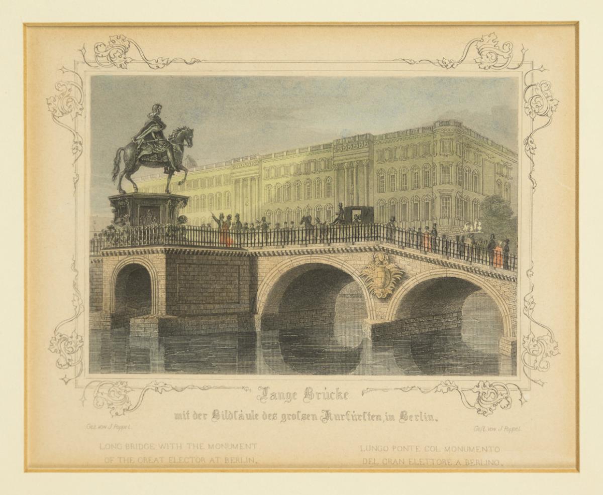 9 Ansichten mit Sehenswürdigkeiten der Stadt Berlin in 3 Rahmen: "Zeughaus und Blüchers Denkmal in Berlin", "Königliche Bibliothek in Berlin", "Opernhaus in Berlin" | "Palais des Pr[inzen] Wilhelm", "Hof d[es] Schlosses in Berlin", "Königliches Schloss in Berlin" | "Lange Brücke", "Brandenburger Thor zu Berlin", "Unter den Linden zu Berlin". Je lichtgebräunt.