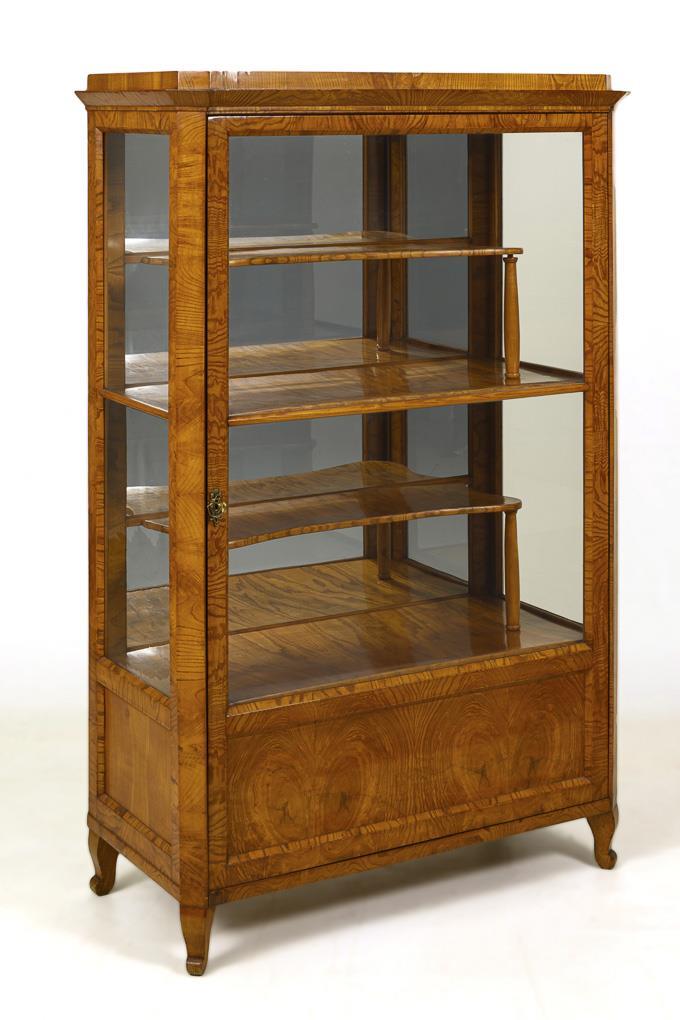 Schlichte, 3-seitig verglaste, 1-türige Vitrine; innen mit 2 Etagerenregalen auf 2 Einlegeböden, 4 Schaufächer und 1 Staufach, Rückwand verspiegelt. Wohnfertig restauriert.