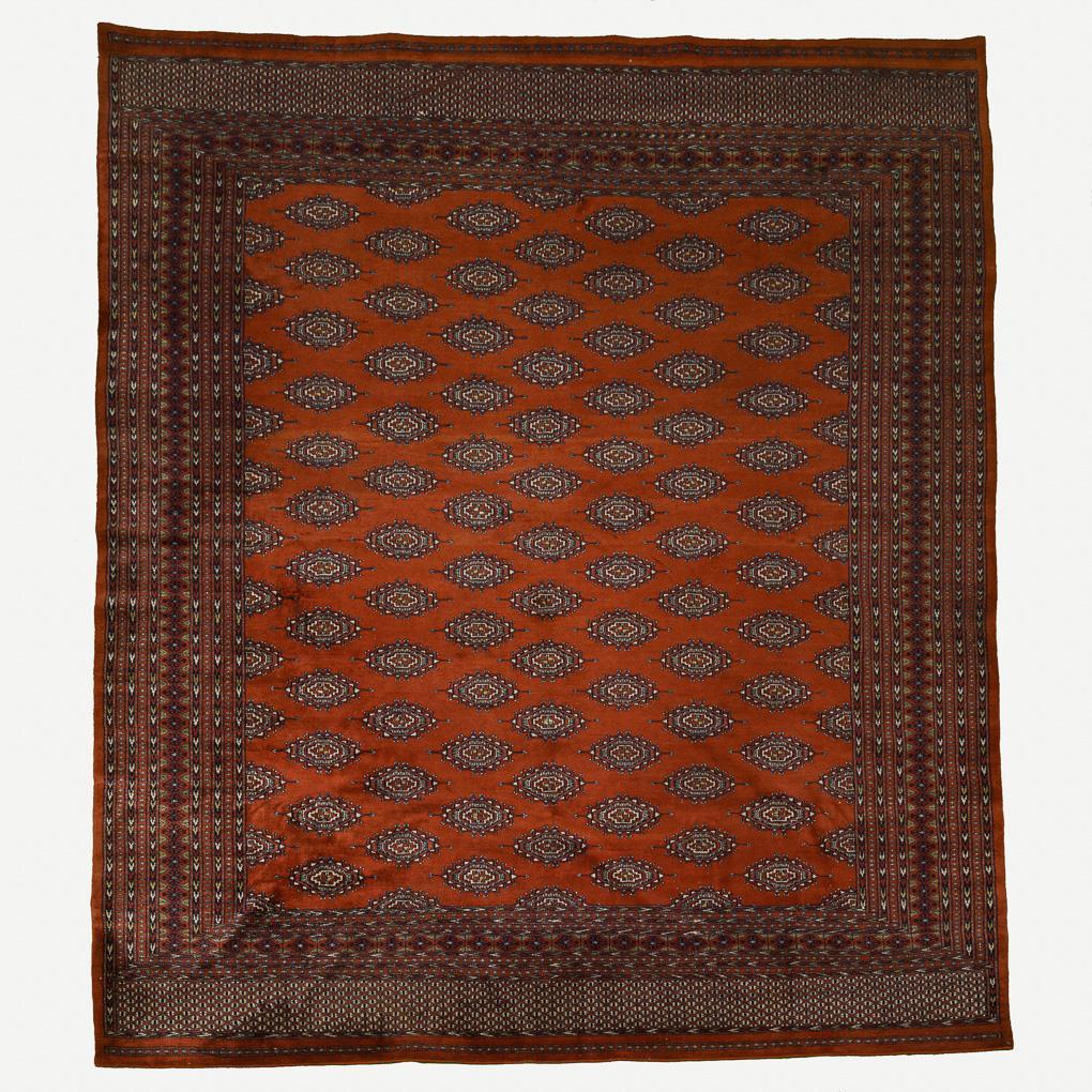 Merzerisierte Wolle, feine Handknüpfung. Vorwiegend rötliches Kolorit. Ca. 309 x 258 cm.