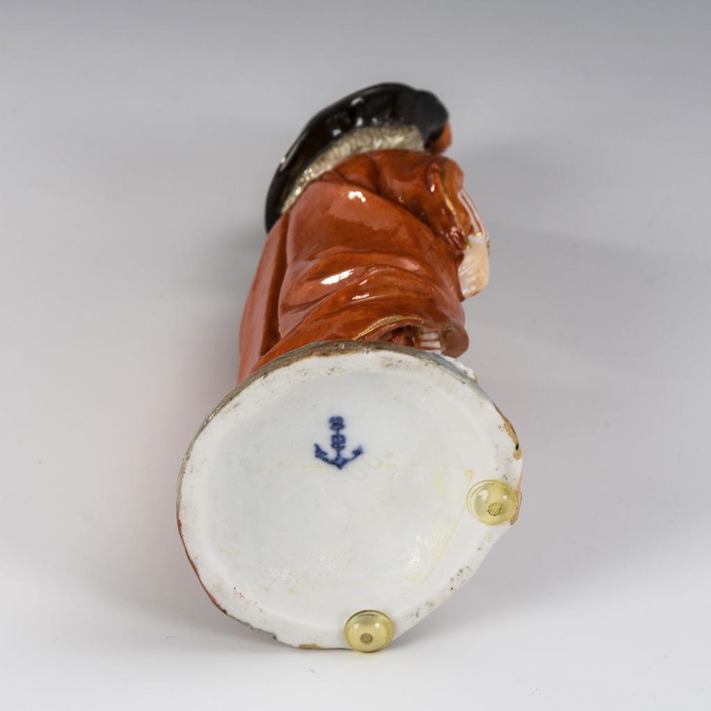 Knabe mit rotem Mantel und federgeschmücktem Hut. Goldabrieb, Hals und Kopf restauriert.