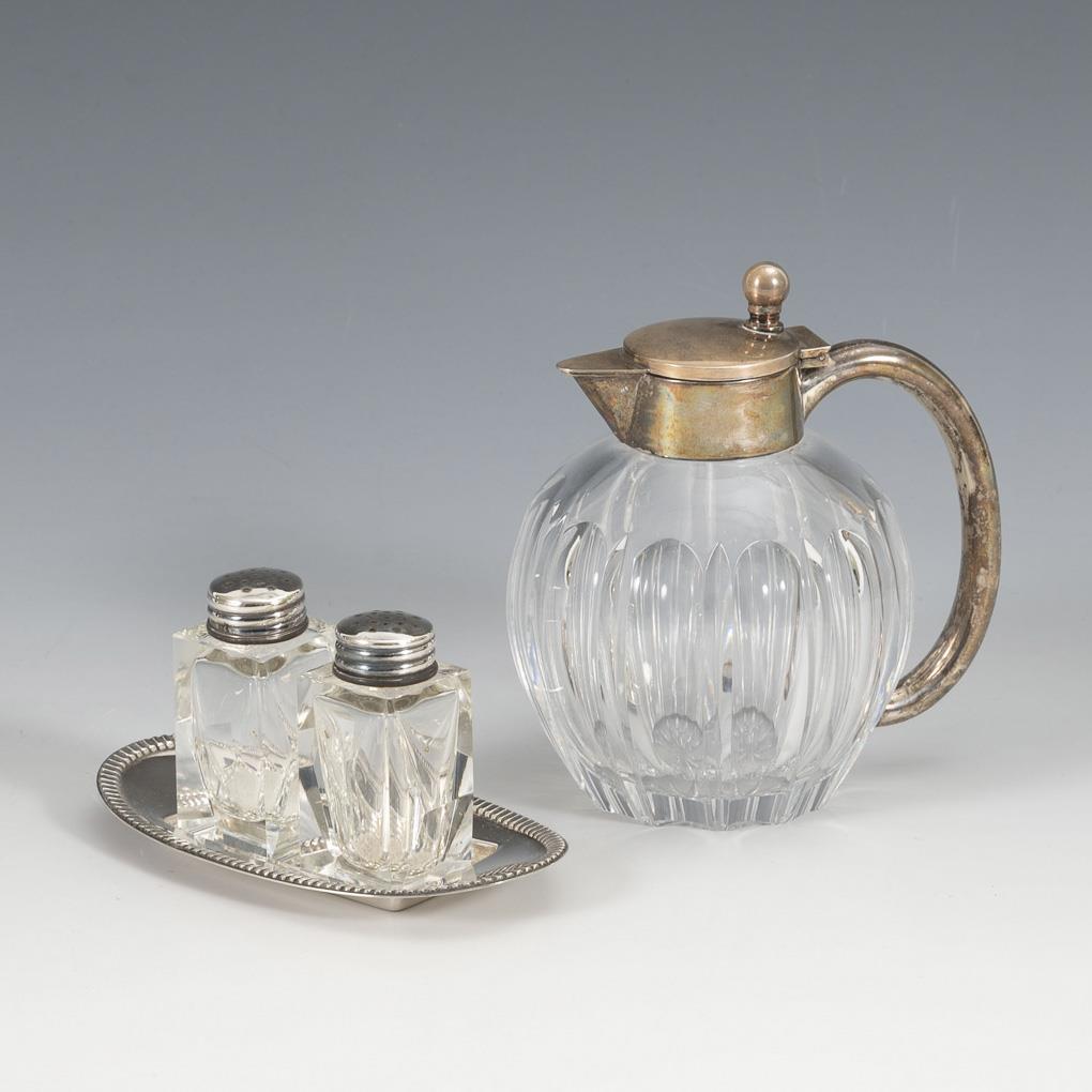 Bauchiges Kännchen mit Silbergriff und flachem Scharnierdeckel (H 11,5 cm). Kleines ovales Silbertablett mit 2 Streuern aus Glas (L 11,5 cm). Gebrauchsspuren.