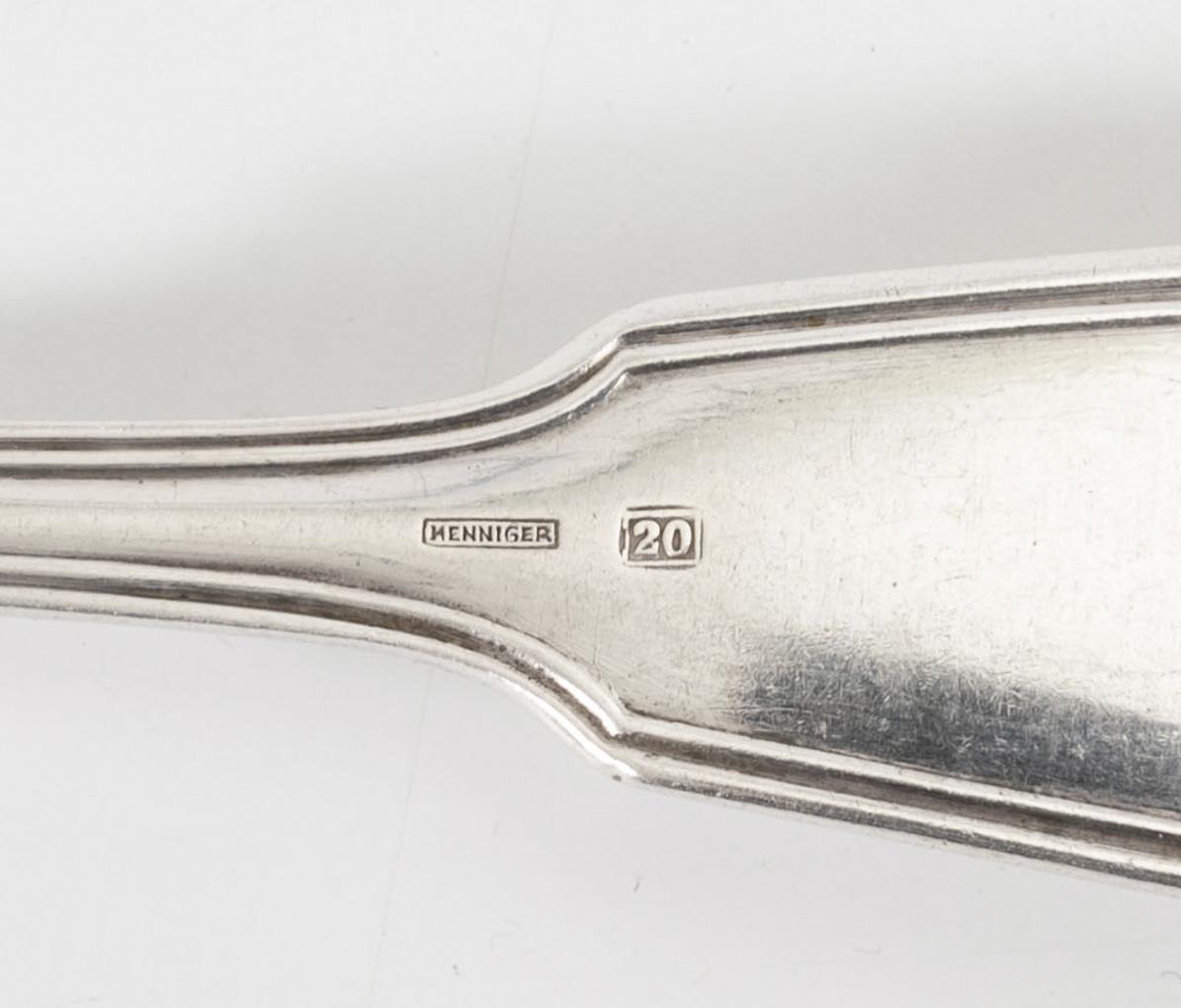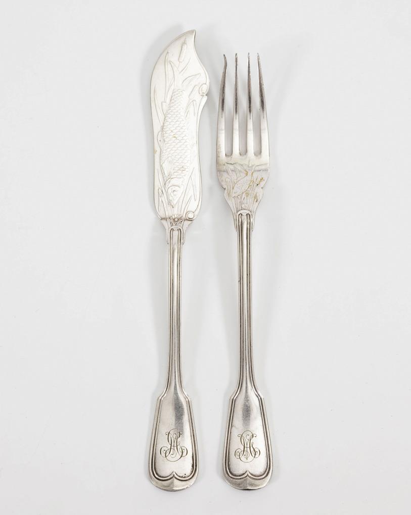 2 verschiedene Fischbestecke, jeweils bestehend aus Messer und Gabel: 18-teilig mit Augsburger Faden mit ligiertem Monogramm "MG". / 6-teilig mit Jugendstil-Blütenmuster. Leichte Gebrauchsspuren.