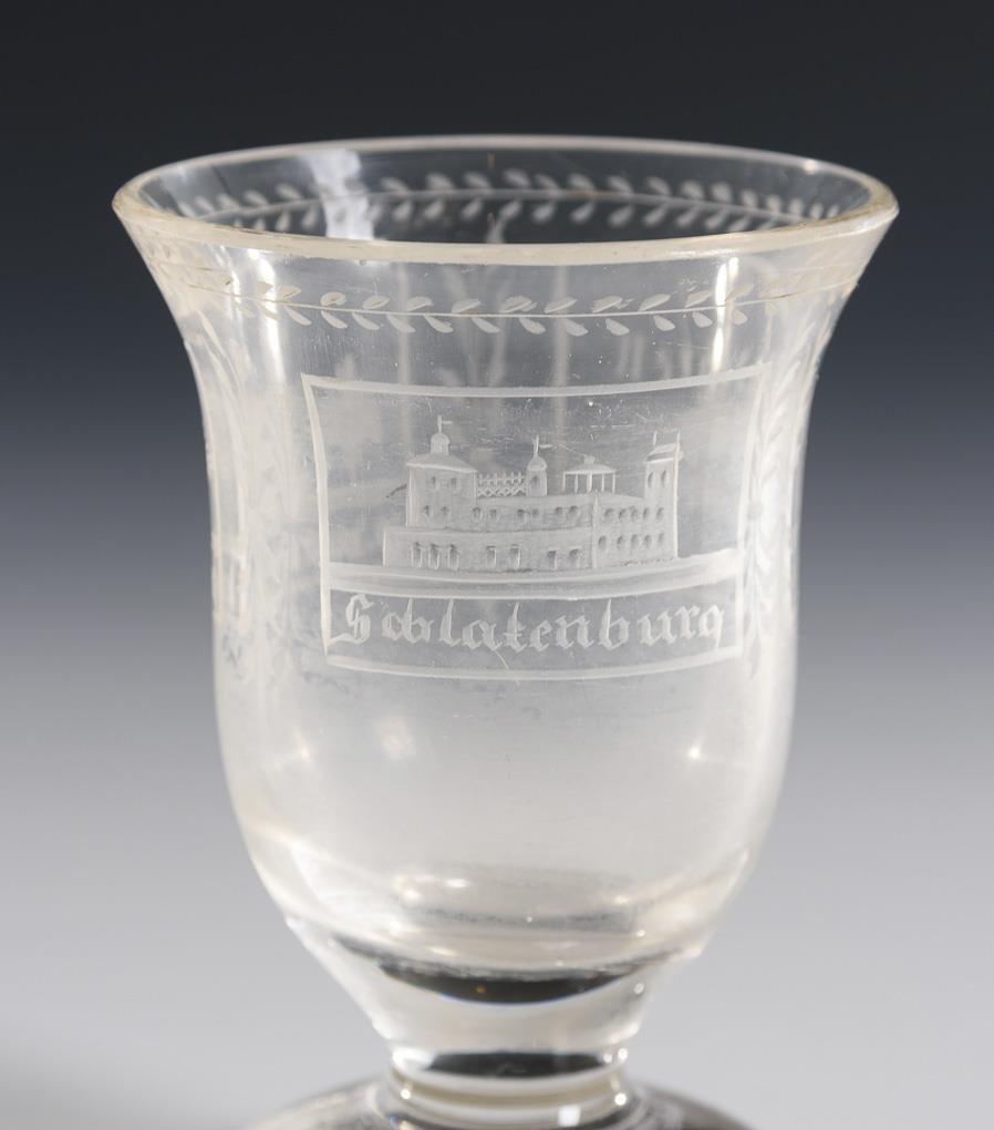 1x Zylinderbecher mit Olivenschliffkranz und gravierten Weinranken. / 1x Fußbecher mit Glockenkuppa sowie zwei gravierten Ansichten und der Bezeichnung "Andenken aus Freundschaft".
