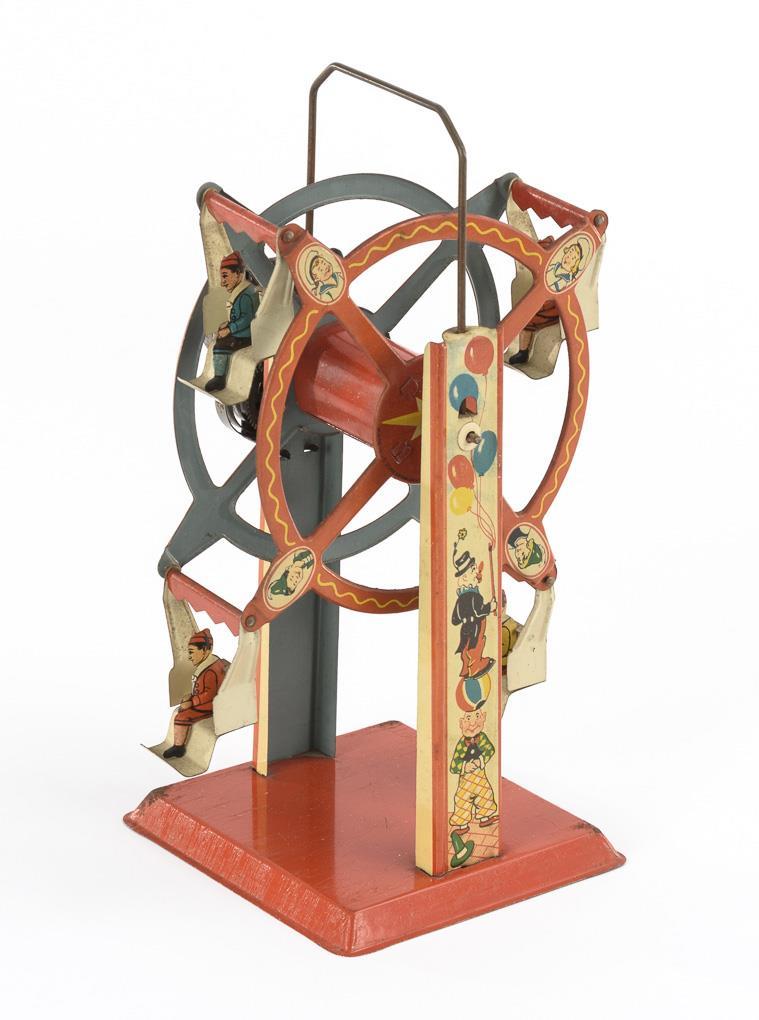 Mechanisches Riesenrad mit Klingel. Federwerk mit festem Schlüssel. Leichte Altersspuren, etwas Rost am Sockel, Feder gebrochen.
