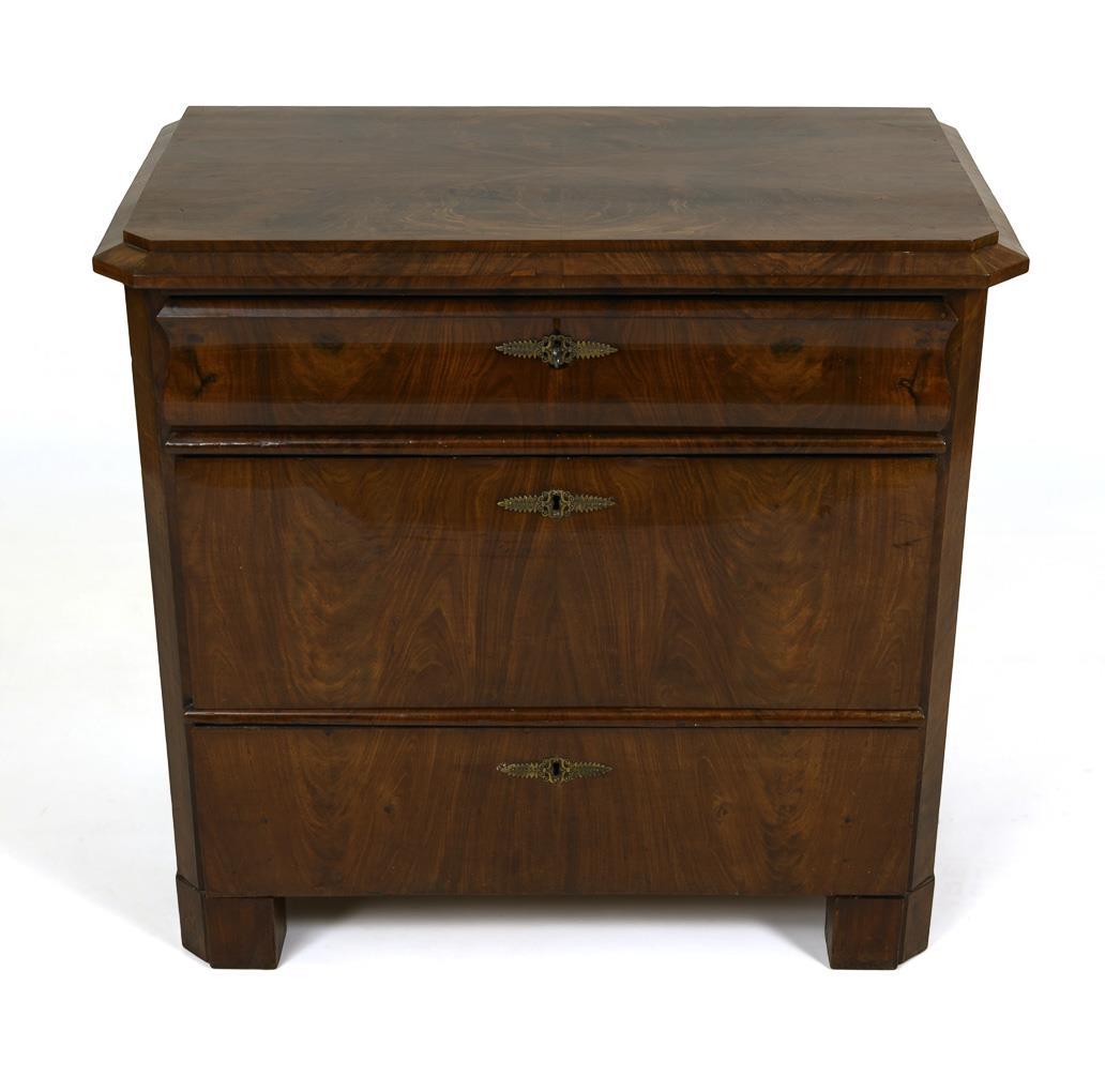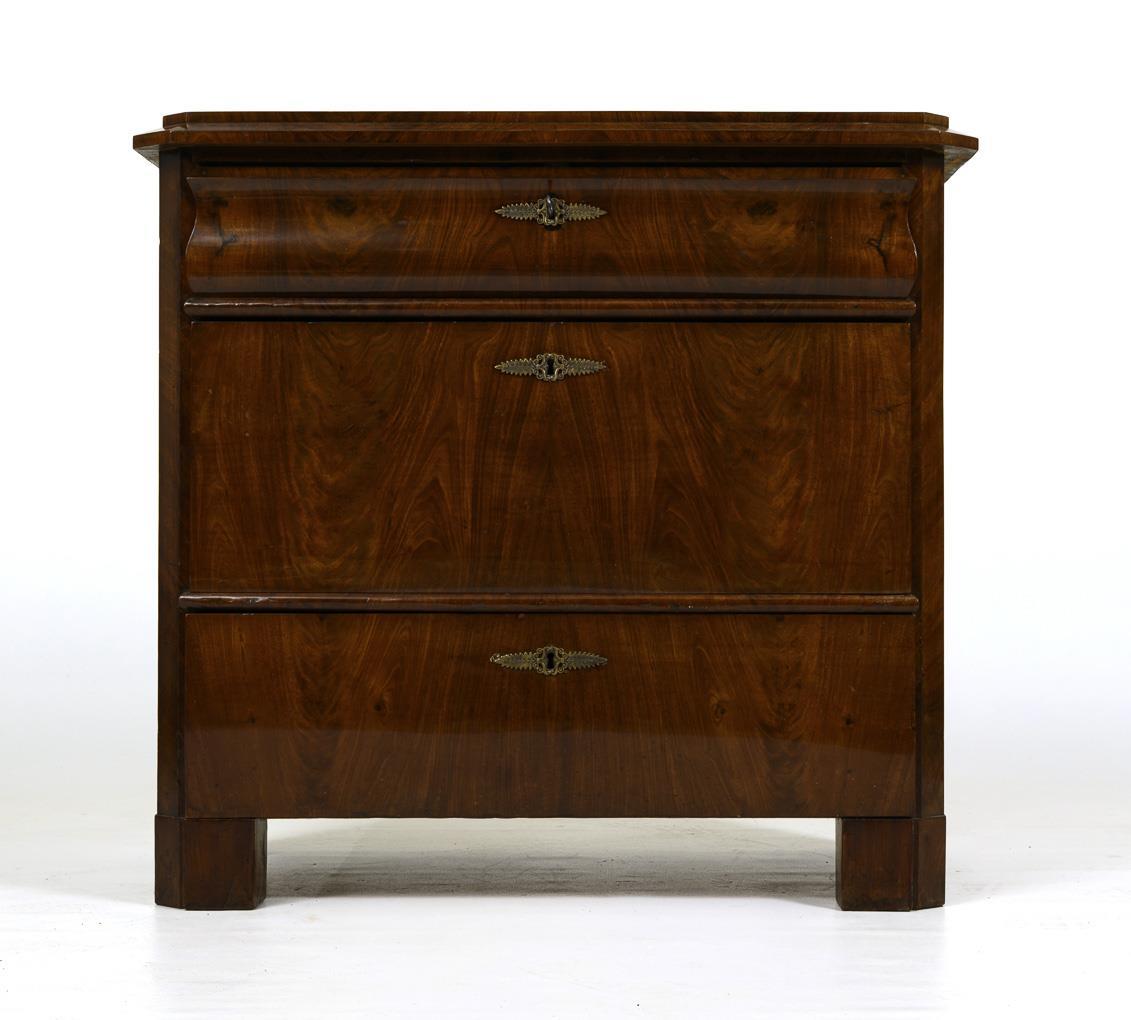 3-schübige Kommode mit verschieden großen Schüben, akzentuiert mit hohlkehlgeformtem, oberen Schub; dekoriert mit gespiegeltem Maserfurnier und vegetabilen Messingbeschlägen. Alters-/Gebrauchsspuren, restauriert.