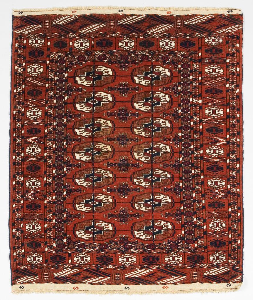 Der kleine turkmenische Teppich ist in Handarbeit geknüpft. Guter hochfloriger Zustand, vollständig mit den originalen Kelim-Abschlüssen erhalten.