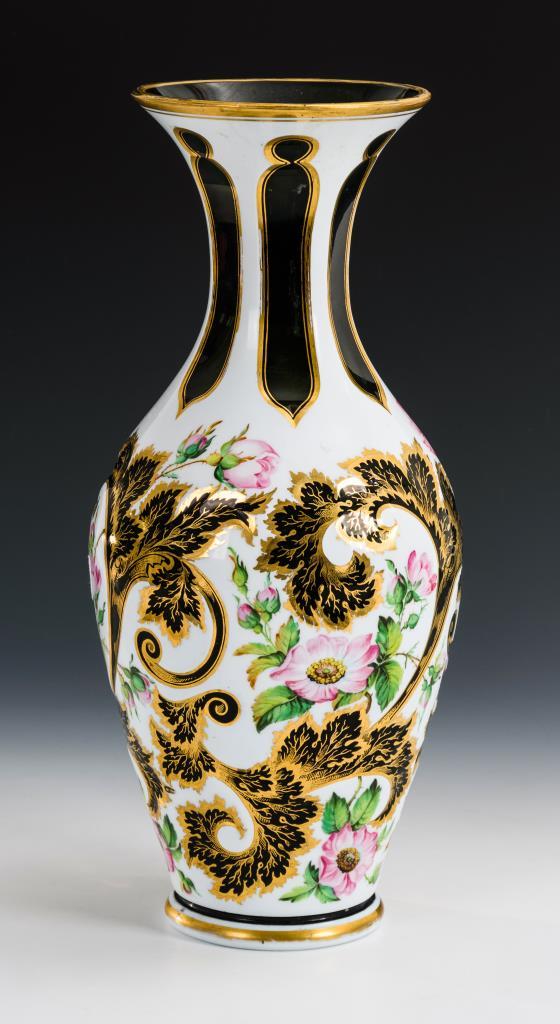 Um 1840/50. Dunkelgrünes, weiß überfangenes Glas. Balustervase mit ausgeschliffenen, rankenden Blättern sowie farbig gemalten Rosenzweigen, goldstaffiert, ausgekugelter Abriss. Gold etwas berieben. H 36 cm.