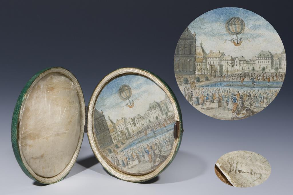 Detailreich sehr fein gemalte historische Szene. Verglastes Original-Etui. Etui-Innendeckel defekt.