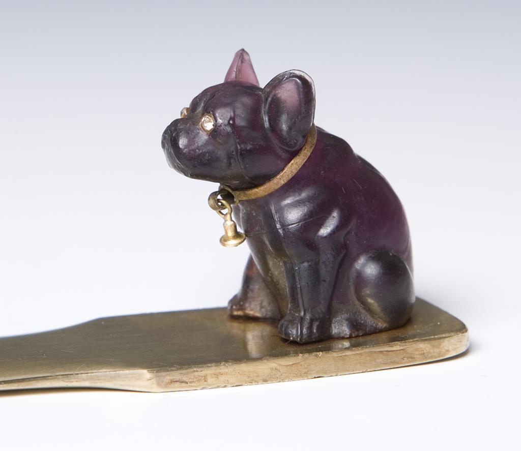 Bronze und amethystfarbenes Glas. Hund mit applizierten Strass-Augen, Metall-Halsband mit Glöckchen. Rückseitig alter Klebezettel.