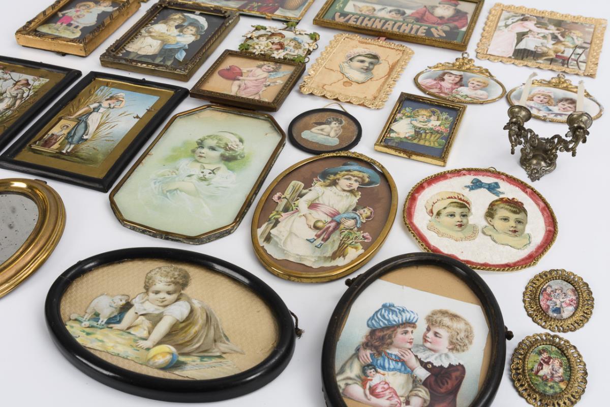 23 meist gerahmte Bilder, 2 ovale Goldspiegel und ein 2-armiger Wandleuchter aus Zinn. Altersspuren, teils kleine Defekte.
