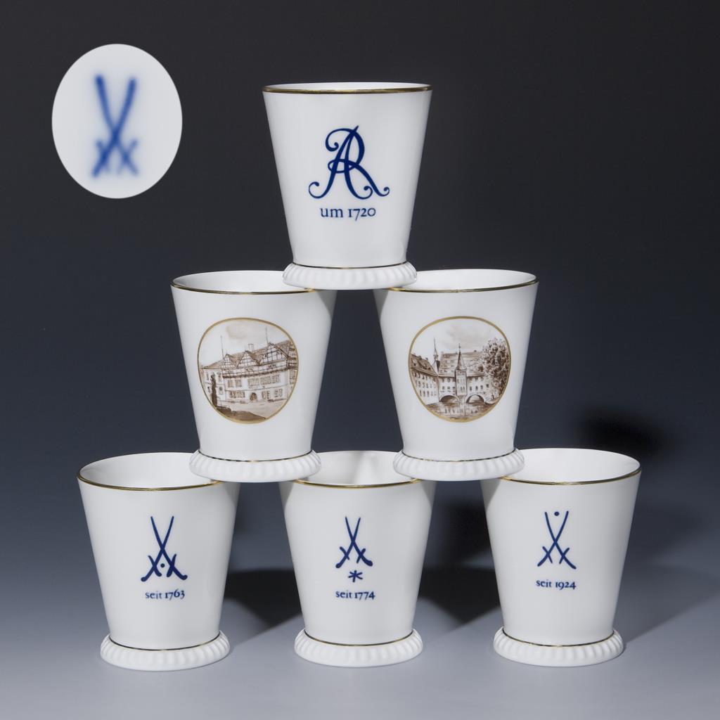 Zwei Becher mit Camaieu-Malerei: Ansichten Blomberg - Rathaus, Nürnberg - Heilig-Geist-Spital. Rückseitig mit blauen Titeln. Vier Becher mit blauen Markenzeichen. Drei Becher rückseitig in Gold bezeichnet: Freunde des Meissener Porzellans. Goldstaffage. Standfüße reliefiert.
