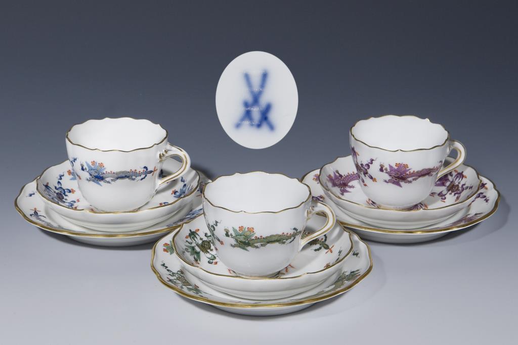 Camaieu-Malerei in Blau, Grün und Purpur, korallenrot und gold schattiert, gold staffiert. Dekor: Reicher Drache.H 5 cm, ø 11 - 14 cm.