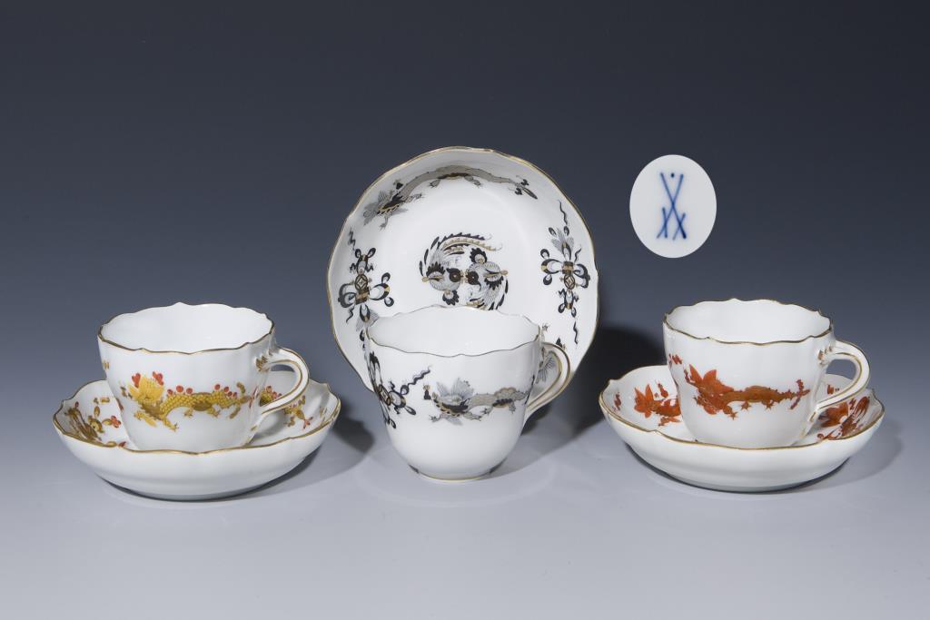 Camieu-Malerei in Gelb, Schwarz und Korallenrot. Gold schattiert und gold staffiert. Dekor: Reicher Drache.H 5 cm, ø 10,5 - 11 cm.