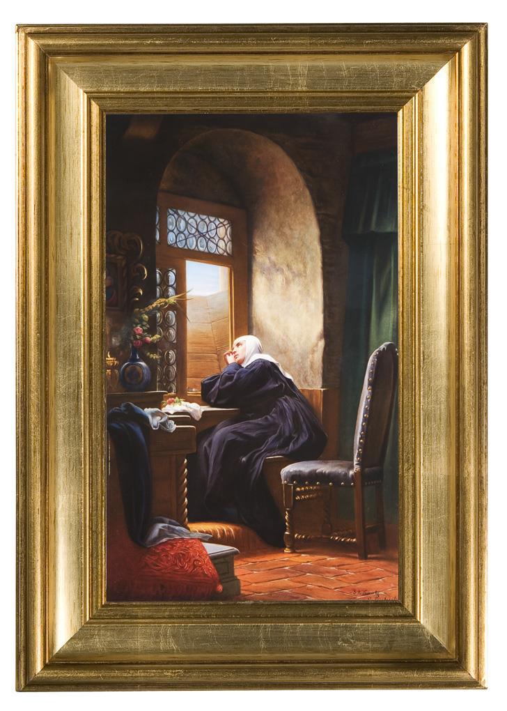 Nach dem Gemälde von Gustav Adolf Kuntz (1873 Wildenfels - 1879 Rom). Farbige Bemalung von Oswald Dietrich, signiert, bezeichnet. Unglasierter Boden, Pressmarken. Profilierter Goldrahmen.