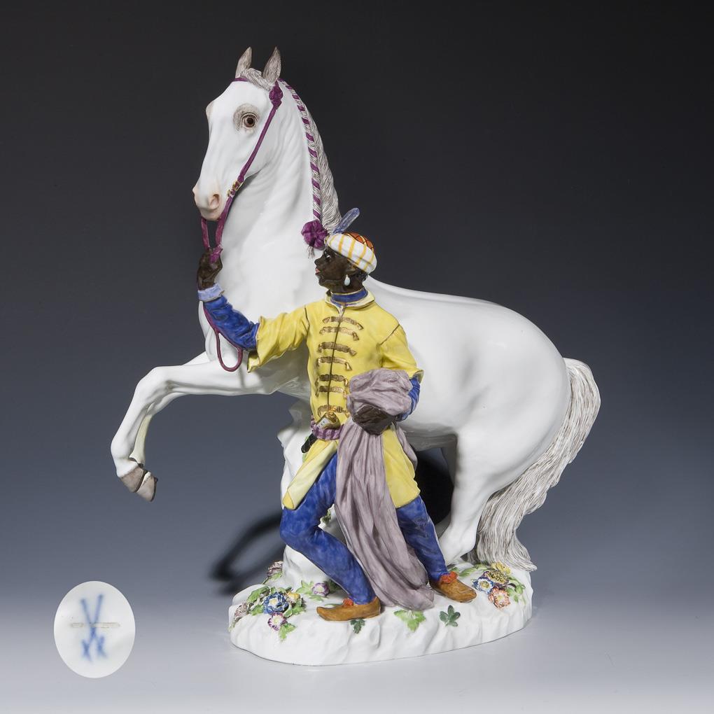 Modell von Johann Joachim Kaendler 1748. Farbig bemalt, gold staffiert. Ritzmarke, Pressmarke, Malermarke, Schwertermarke am Sockel einmal gestrichen. Im Sockel Haarriss, eine Bruchstelle am Pferdebein, Zügel, Turbanfeder restauriert.