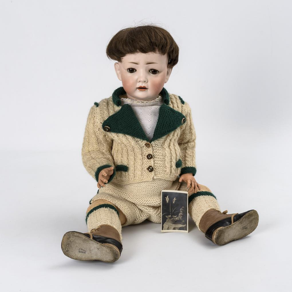 Kurbelkopf, braune Schlafaugen, Wimpern, jünger ergänzte braune Echthaarperücke. 7-teiliger Sitzbabykörper mit beweglichen Celluloidhänden. Weiß-grüne Strickkleidung, schwarz-braune Kinderschuhe. Dazu kleines Foto der Puppe aus den 1920er/30er Jahren. Kopf mit Ausbruch und kleinen Chips an der Halskurbel (verdeckt). Körper mit kleinen Farbdefekten.