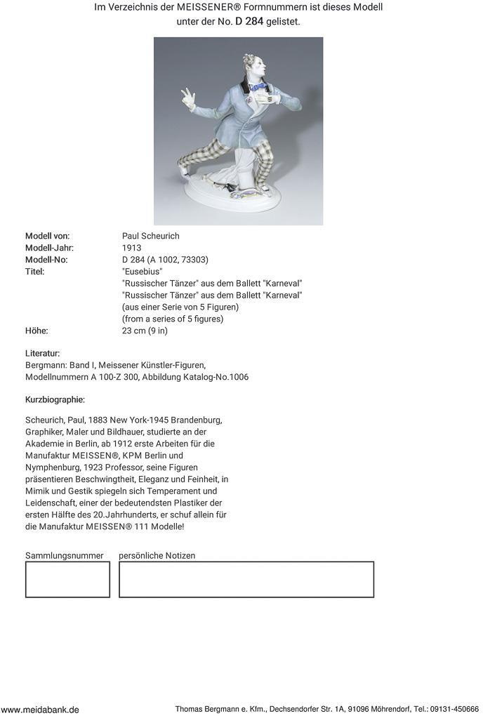 Scheurich, Graphiker, Maler und Bildhauer. Studierte an der Akademie in Berlin. Ab 1912 erste Arbeiten für Meissen, KPM Berlin und Nymphenburg. 1923 Professor. Meissen-Manufaktur-Preis: 7490,- Euro * Partnerauktion Bergmann.