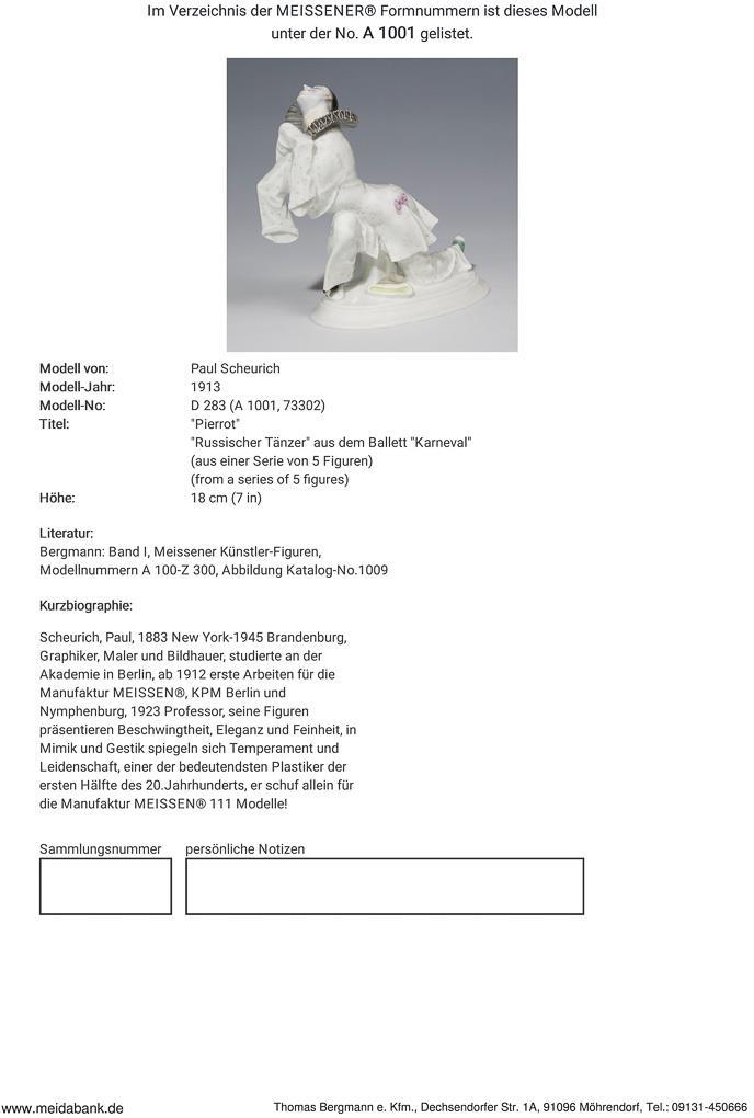 Scheurich, Graphiker, Maler und Bildhauer. Studierte an der Akademie in Berlin. Ab 1912 erste Arbeiten für Meissen, KPM Berlin und Nymphenburg. 1923 Professor. Meissen-Manufaktur-Preis: 5790,- Euro * Partnerauktion Bergmann.