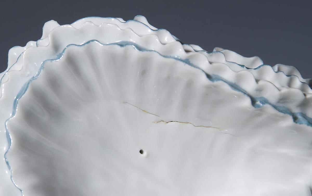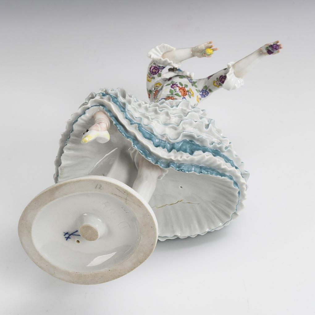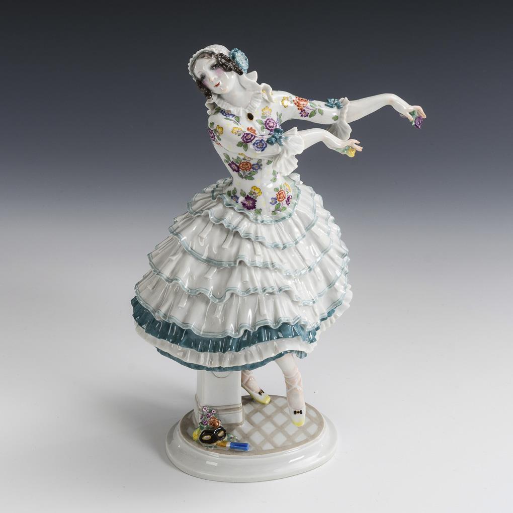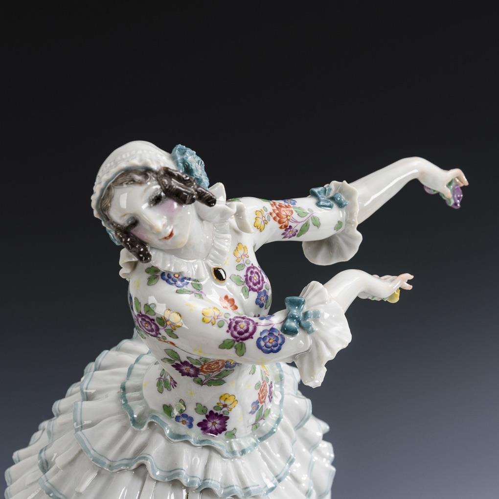 Modell von Paul Scheurich 1913. Farbig bemalt. Ritzmarke, Pressmarke, Schwertermarke. Von unten im Rock Brandriss, unterste Rüsche mit kleinem Glasurdefekt.