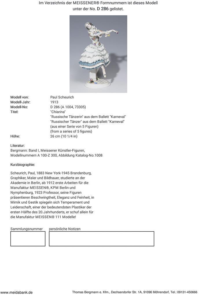 Scheurich, Graphiker, Maler und Bildhauer. Studierte an der Akademie in Berlin. Ab 1912 erste Arbeiten für Meissen, KPM Berlin und Nymphenburg. 1923 Professor. Meissen-Manufaktur-Preis: 12000,- Euro * Partnerauktion Bergmann.