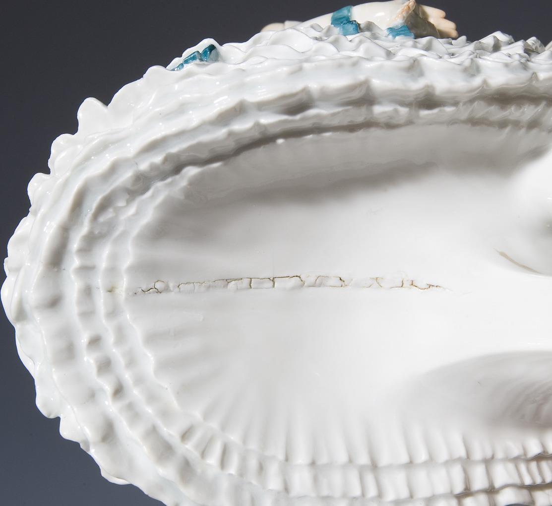 Modell von Paul Scheurich 1913. Farbig bemalt. Ritzmarke, Pressmarke, Malermarke, Schwertermarke einmal gestrichen. Eine Hand, Krawatte, Sockelrand restauriert, von unten im Rock Brandriss, kleiner Glasudefekt am Bein, Stütze mit minimalem Haarriss, Band minimal bestoßen.