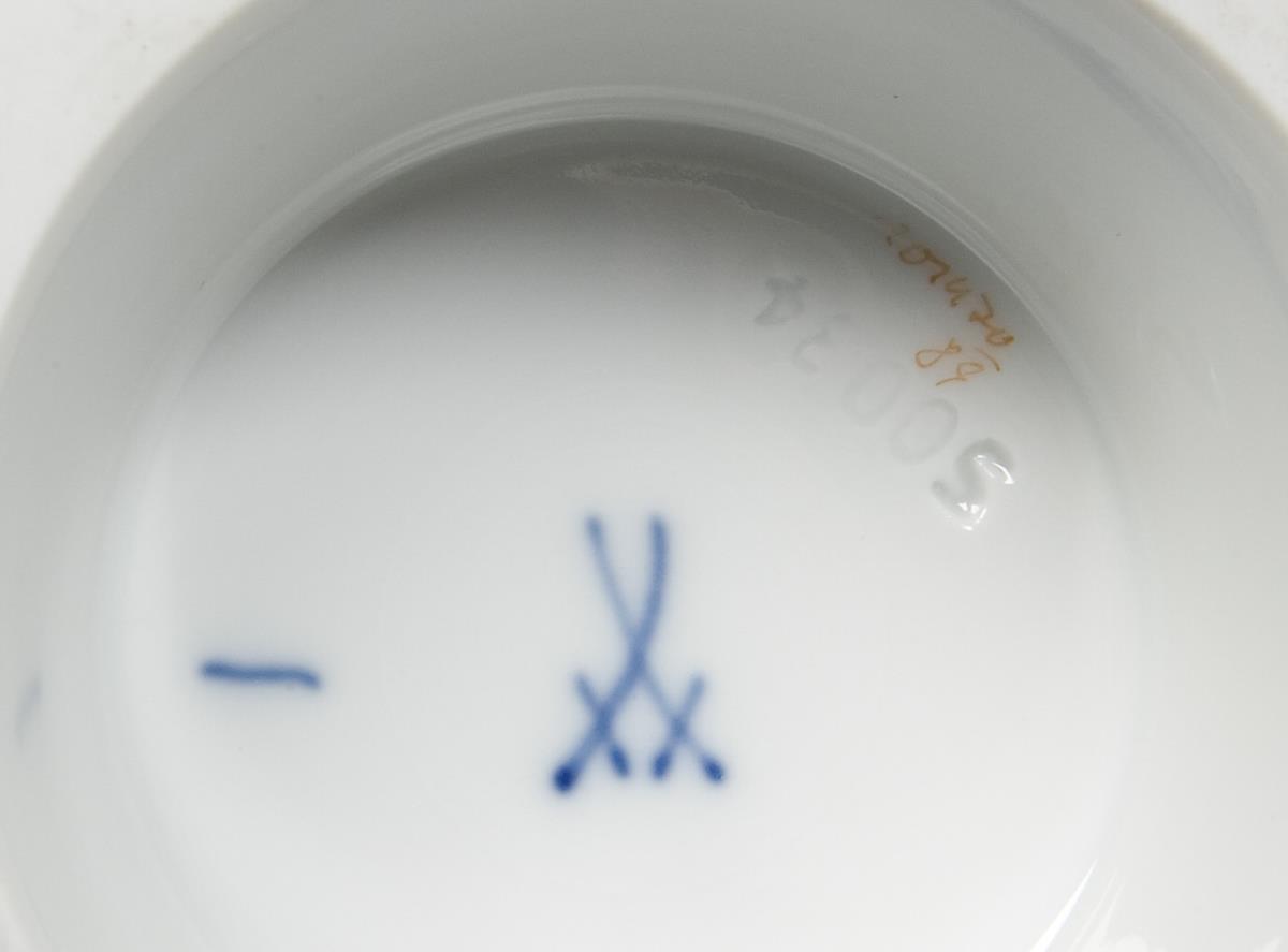 Form-Modell von Johann Daniel Schöne 1818. Beidseits feine farbige Bemalung, in passig geschweiften Reserven üppige Blumenbuketts, kobaltblauer Fond, ornamentale Goldstaffage, Goldränder. Malermarke, Pressmarken, Schwertermarke.